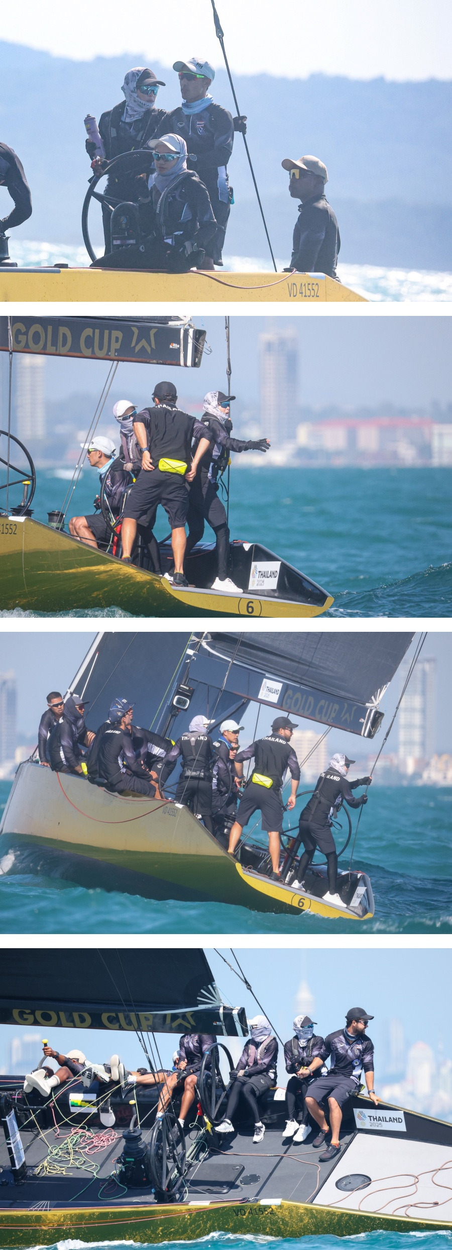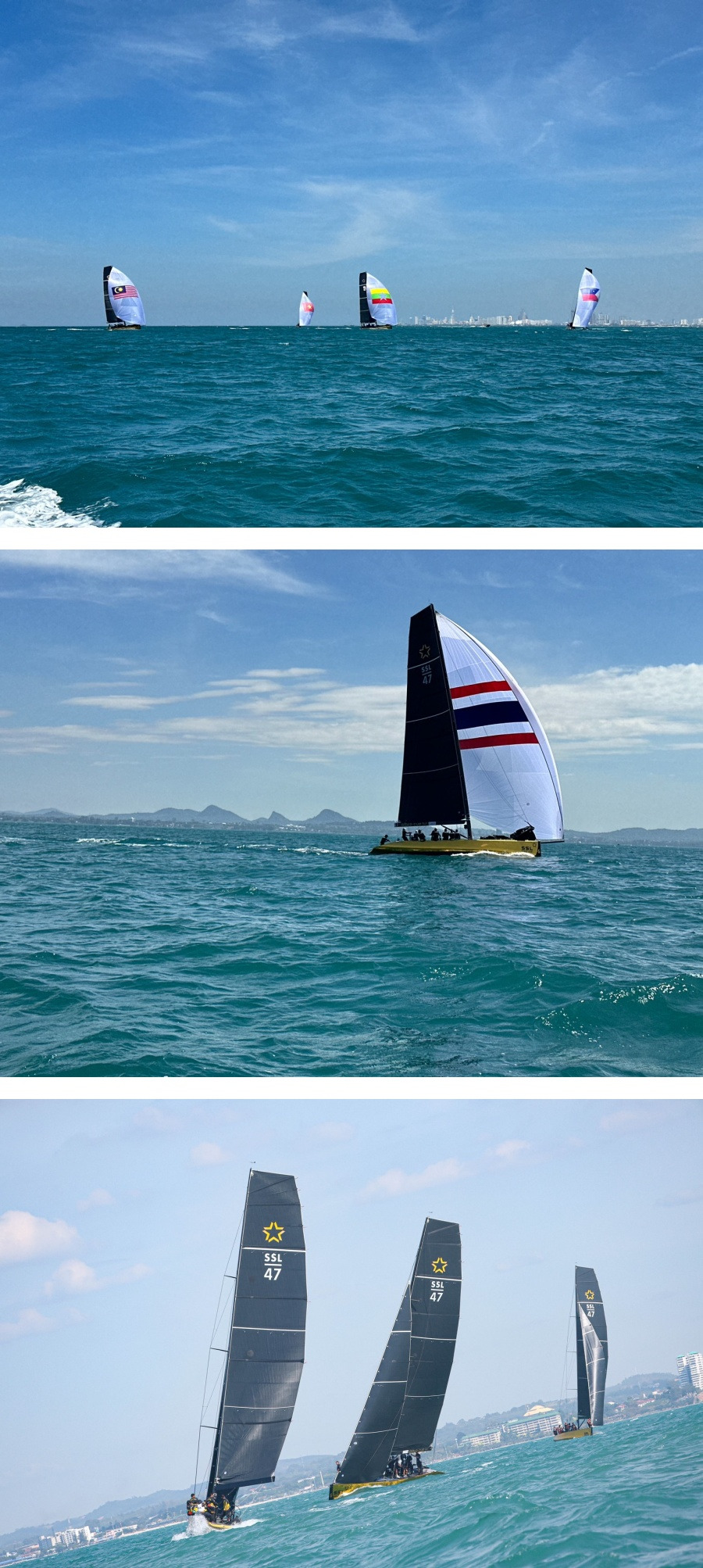 วันนี้เป็นการแข่งขันเก็บคะแนนวันที่ 1 ของกีฬาเรือใบ ประเภทเรือคีลโบท SSL47 สมเด็จพระนางเจ้าฯ พระบรมราชินี ทรงฉลองพระองค์ชุดกีฬาทีมชาติไทย นำทัพนักกีฬาเรือใบ ขึ้นเรือใบ SSL47 หมายเลข 6 ออกไปเก็บคะแนนการแข่งขันกลางทะเลอ่าวไทย จำนวน 3 เรซ ร่วมกับนักกีฬาจาก 4 ชาติ ที่เข้าร่วมการแข่งขัน ได้แก่ เวียดนาม ฟิลิปปินส์ มาเลเซีย และเมียนมา ด้วยพระพักตร์ที่เปี่ยมไปด้วยพระเมตตา หากแต่เต็มไปด้วยพระราชหฤทัยอันมุ่งมั่น หวังที่จะนำเหรียญทองมาพระราชทานให้แก่ประชาชนชาวไทยทุกคน
