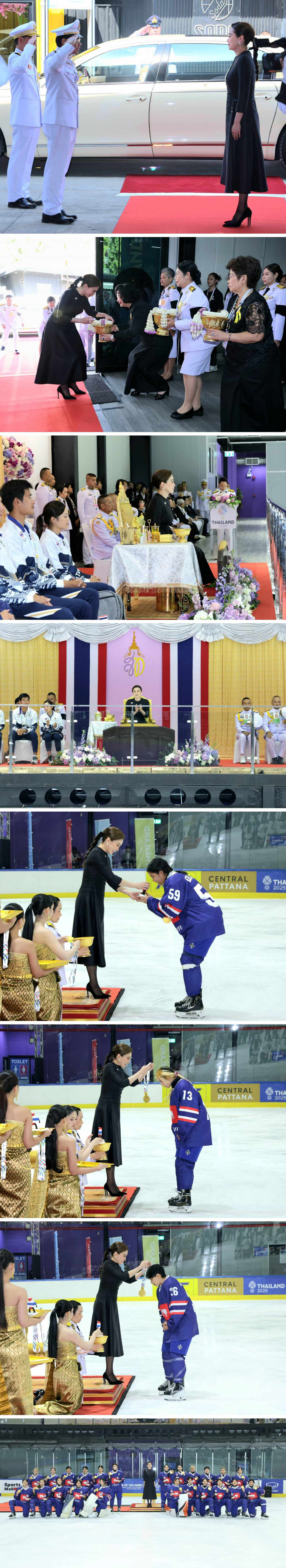 เมื่อเสด็จพระราชดำเนินถึงสนามฮอกกี้น้ำแข็ง “ไทยแลนด์ อินเตอร์เนชันแนล ไอซ์ ฮอกกี้ อารีนา” นายอรรถกร ศิริลัทธยากร รัฐมนตรีว่าการกระทรวงการท่องเที่ยวและกีฬา นายก้องศักด ยอดมณี ผู้ว่าการการกีฬาแห่งประเทศไทย หม่อมหลวงกฤษฎา เกษมสันต์ นายกสมาคมกีฬาฮอกกี้น้ำแข็งแห่งประเทศไทย พร้อมด้วยคณะกรรมการ และคณะทำงานจัดการแข่งขัน ฯ เฝ้าทูลละอองธุลีพระบาทรับเสด็จ จากนั้น เสด็จเข้าภายในสนามฮอกกี้น้ำแข็ง “ไทยแลนด์ อินเตอร์เนชันแนล ไอซ์ ฮอกกี้ อารีนา” พระราชทานพระราชวโรกาสให้รัฐมนตรีว่าการกระทรวงการท่องเที่ยวและกีฬา เฝ้าทูลละอองธุลีพระบาท กราบบังคมทูลรายงานวัตถุประสงค์ของการจัดการแข่งขัน ฯ และหม่อมหลวงกฤษฎา เกษมสันต์ นายกสมาคมกีฬาฮอกกี้น้ำแข็งแห่งประเทศไทย เฝ้าทูลละอองธุลีพระบาท ทูลเกล้าทูลกระหม่อมถวายของที่ระลึก