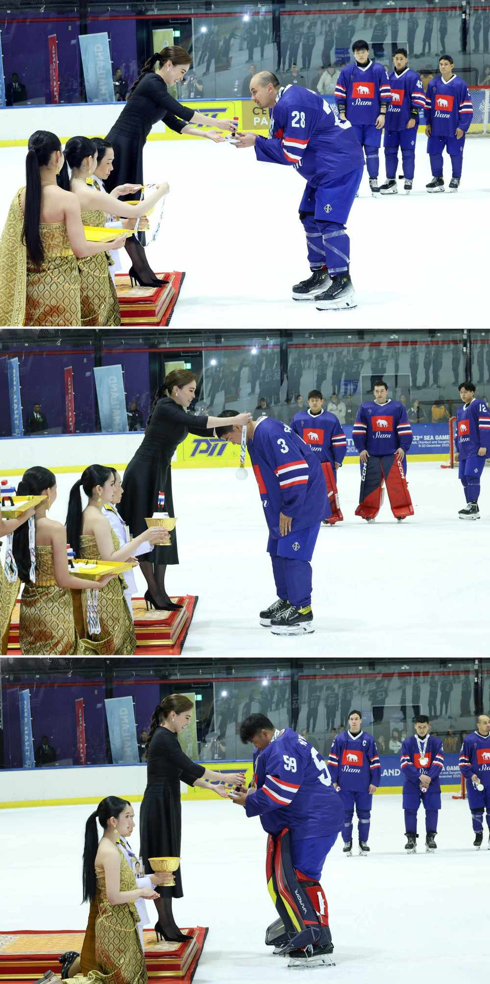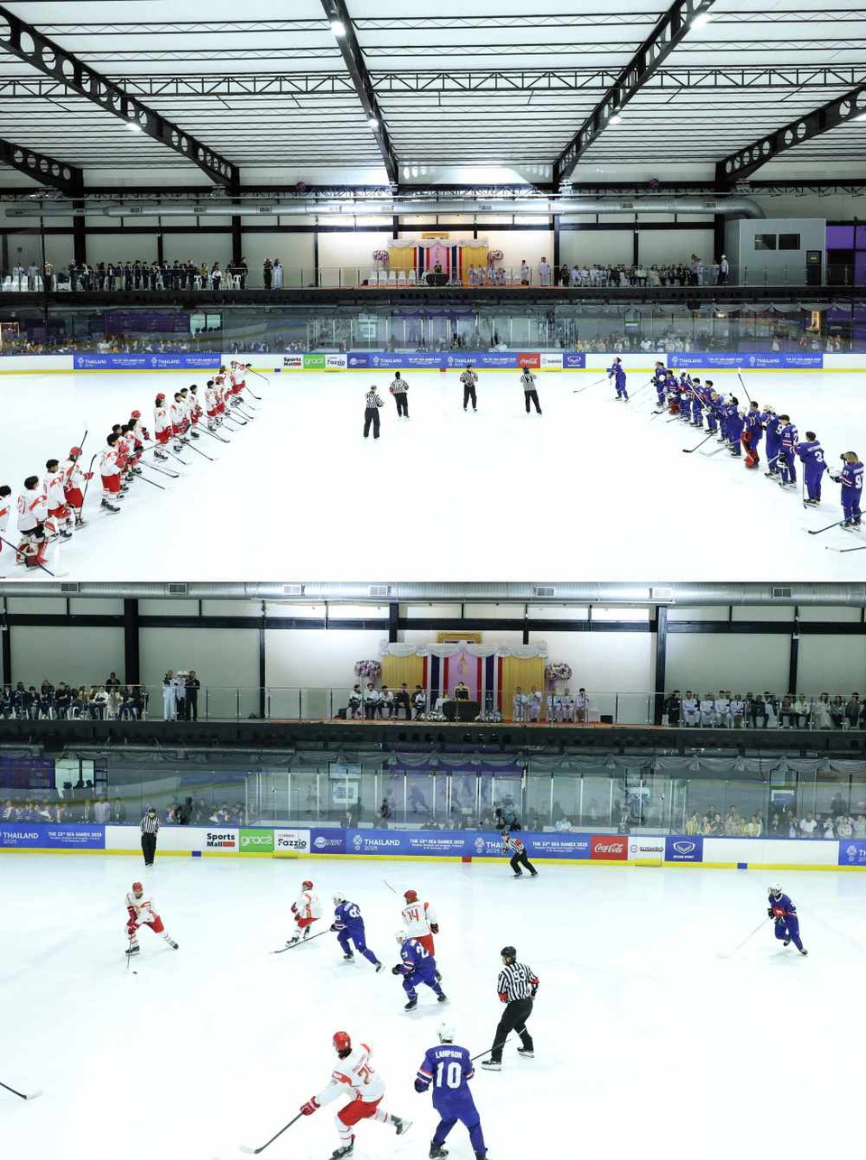 วันที่ 19 ธ.ค.68 เวลา 17.50 น. สมเด็จพระนางเจ้า ฯ พระบรมราชินี เสด็จพระราชดำเนินไปทอดพระเนตรการแข่งขันกีฬาฮอกกี้น้ำแข็ง รอบชิงชนะเลิศ ประเภททีมชาย ระหว่างทีมประเทศไทย และทีมสาธารณรัฐอินโดนีเซีย โดยการแข่งขันแบ่งออกเป็น 3 พีเรียด (Period) พีเรียดละ 20 นาที จบการแข่งขัน 3 พีเรียด สาธารณรัฐอินโดนีเซีย ชนะประเทศไทย 3 ประตูต่อ 2