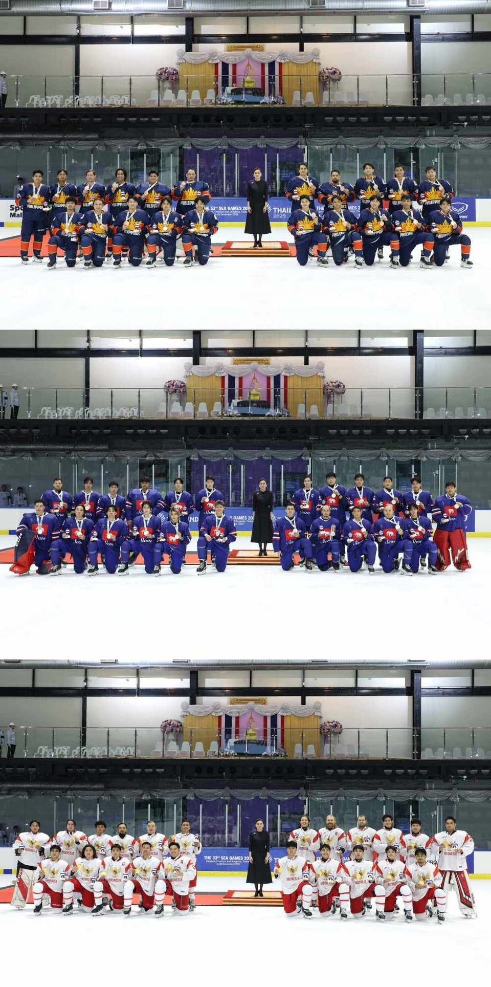 เมื่อจบการแข่งขันแล้ว สมเด็จพระนางเจ้า ฯ พระบรมราชินี พระราชทานพระราชวโรกาสให้ นักกีฬาฮอกกี้น้ำแข็ง ประเภททีมชาย ที่ได้รับเหรียญรางวัล รองชนะเลิศอันดับ 2 ได้แก่ สาธารณรัฐฟิลลิปินส์ รองชนะเลิศอันดับ 1 ได้แก่ ประเทศไทย และชนะเลิศอันดับ 1 ได้แก่ สาธารณรัฐอินโดนีเซีย ลีพระบาท รับพระราชทานเหรียญรางวัล สมควรแก่เวลา จึงเสด็จออกจากสนามฮอกกี้น้ำแข็ง ฯ จึงประทับรถยนต์พระที่นั่ง เสด็จพระราชดำเนินกลับ