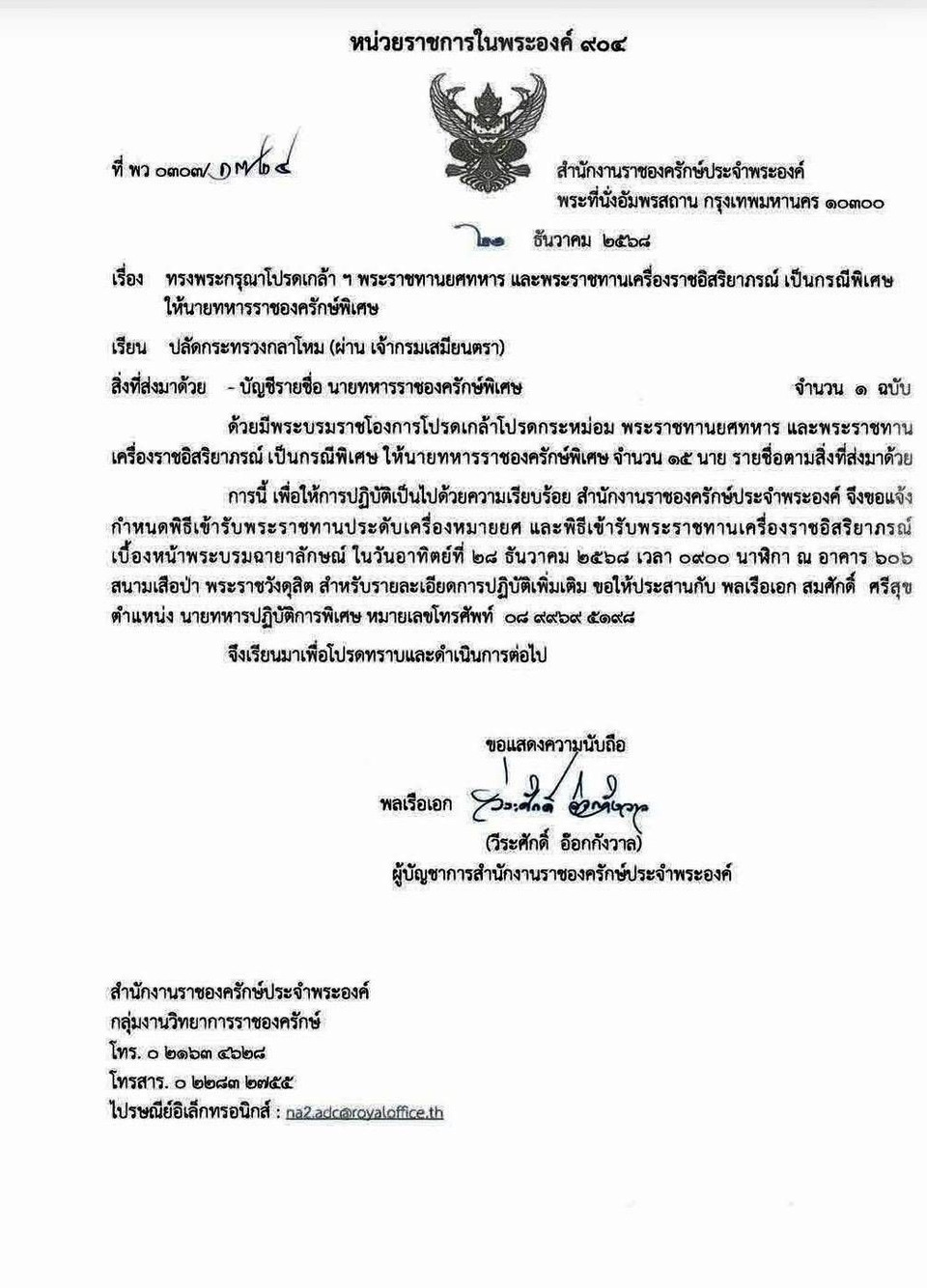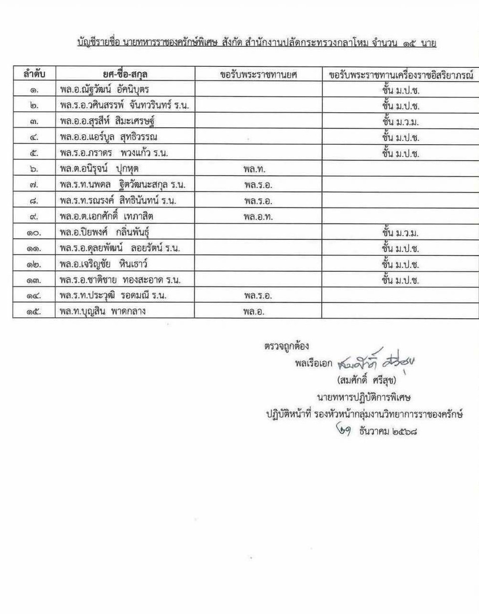 เมื่อวันที่ 23 ธ.ค.2568 พระบาทสมเด็จพระเจ้าอยู่หัว ทรงพระกรุณาโปรดเกล้าฯ พระราชทานยศทหาร และพระราชทานเครื่องราชอิสริยาภรณ์ เป็นกรณีพิเศษ ให้นายทหารราชองครักษ์พิเศษ 15 นาย