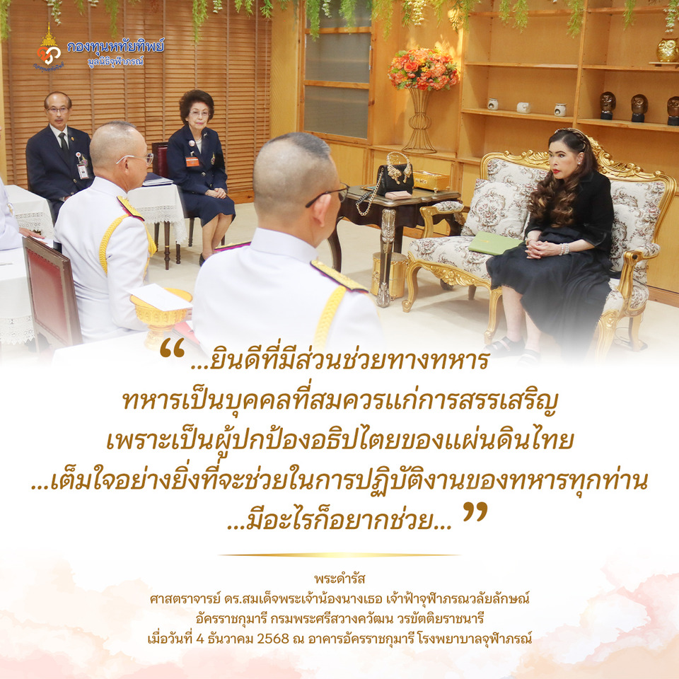 จากสถานการณ์ความไม่สงบตามแนวชายแดนไทย-กัมพูชาที่ได้ส่งผลกระทบต่อความปลอดภัยของกำลังพลและพี่น้องประชาชนที่อาศัยอยู่ตลอดแนวชายแดน ศาสตราจารย์ ดร.สมเด็จพระเจ้าน้องนางเธอ เจ้าฟ้าจุฬาภรณวลัยลักษณ์ อัครราชกุมารี กรมพระศรีสวางควัฒน วรขัตติยราชนารี ทรงติดตามสถานการณ์อย่างใกล้ชิด และพระราชทานความช่วยเหลืออย่างเร่งด่วนและเป็นรูปธรรม ดังพระประสงค์ในการจัดตั้ง “กองทุนหทัยทิพย์” ภายใต้มูลนิธิจุฬาภรณ์ โดยทรงดำรงตำแหน่งเป็นประธานกรรมการบริหารกองทุนฯ และทรงเป็นประธานเปิดโครงการกองทุนหทัยทิพย์ ภายใต้มูลนิธิจุฬาภรณ์อย่างเป็นทางการ พร้อมพระราชทานทรัพย์ส่วนพระองค์จำนวนเงิน 1,000,000 บาท ให้แก่กองทุนฯ เพื่อเป็นทุนตั้งต้นในการดำเนินกิจกรรม หรือโครงการสาธารณประโยชน์ด้านต่างๆ เมื่อวันที่ 24 กันยายน พ.ศ. 2568 ณ ศูนย์ประชุมสถาบันวิจัยจุฬาภรณ์ และได้พระราชทานเพิ่มเติมอีก 20,000,000 บาทในโอกาสต่อมา