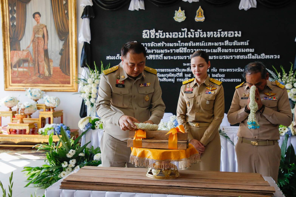 วันที่ 25 ธ.ค.68 นางสาวซาบีดา ไทยเศรษฐ์ รัฐมนตรีว่าการกระทรวงวัฒนธรรม รับมอบไม้จันทน์หอมสำหรับจัดสร้างพระโกศจันทน์และพระหีบจันทน์ เพื่อใช้ในงานพระราชพิธีถวายพระเพลิงพระบรมศพสมเด็จพระนางเจ้าสิริกิติ์ พระบรมราชินีนาถ พระบรมราชชนนีพันปีหลวง จากกระทรวงทรัพยากรธรรมชาติและสิ่งแวดล้อม โดยนายสุชาติ ชมกลิ่น รัฐมนตรีว่าการกระทรวงทรัพยากรธรรมชาติและสิ่งแวดล้อม เป็นผู้ส่งมอบ ที่สำนักช่างสิบหมู่ กรมศิลปากร จังหวัดนครปฐม
