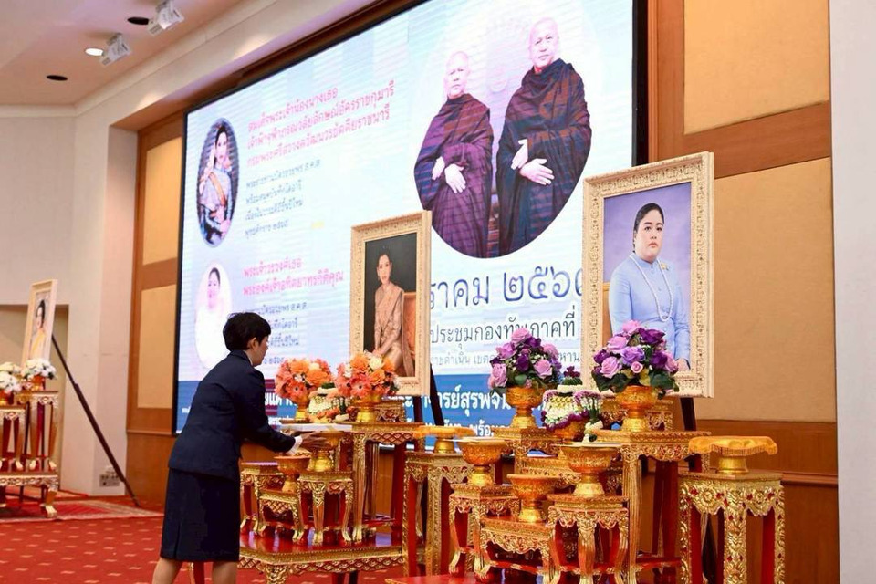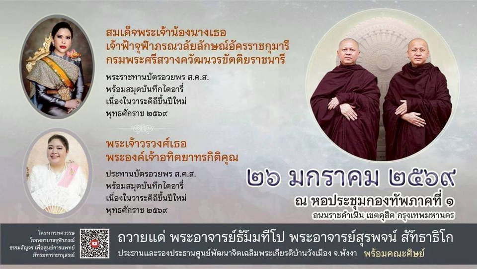 ศาตราจารย์ ดร.สมเด็จพระเจ้าน้องนางเธอ เจ้าฟ้าจุฬาภรณ์วลัยลักษณ์ อัครราชกุมารี กรมพระศรีสวางควัฒน วรขัตติยราชนารี พระราชทานบัตรอวยพร ส.ค.ส.พร้อมสมุดบันทึกใดอารี่ เนื่องในวาระดิถีขึ้นปีใหม่ พุทธศักราช 2569 ถวายแด่พระอาจารย์ธัม์มทีโป ประธานศูนย์พัฒนาจิตเฉลิมพระเกียรติ์บ้านวังเมือง พระอาจารย์สุรพจน์ สัท์ธาธิโก รองประธานศูนย์พัฒนาจิตเฉลิมพระเกียรติ์บ้านวังเมือง จังหวัดพังงา องค์ประธานอุปถัมภ์และแสดงธรรมในโครงการทศวรรษโรงพยาบาลจุฬาภรณ์ธรรมสัญจรเพื่อศูนย์การแพทย์ภัทรมหาราชานุสรณ์ ราชวิทยาลัยจุฬาภรณ์