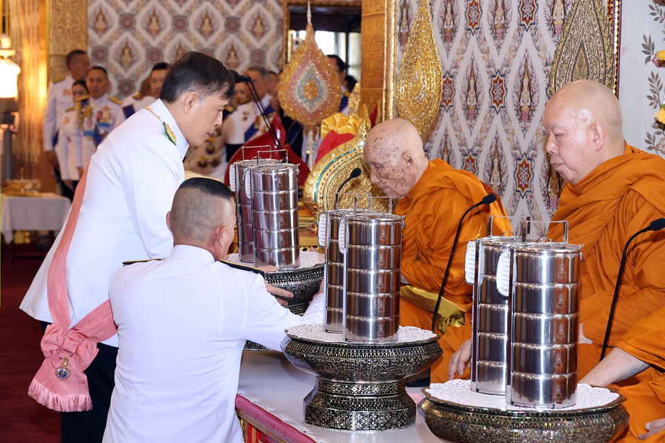 จบแล้ว พระสงฆ์ 30 รูป ถวายพรพระ เสร็จแล้ว พระบาทสมเด็จพระเจ้าอยู่หัว เสด็จพระราชดำเนินไปทรงประเคนภัตตาหารแด่สมเด็จพระอริยวงศาคตญาณ สมเด็จพระสังฆราช สกลมหาสังฆปริณายก สมเด็จพระราชาคณะ