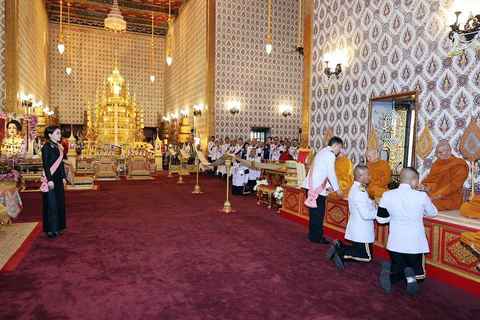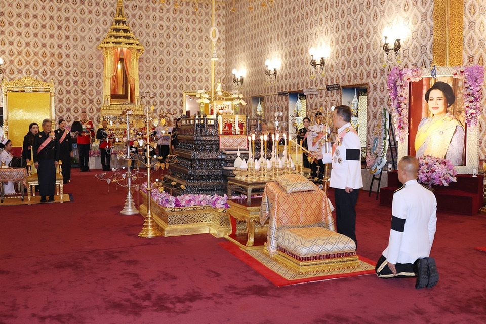 เสร็จแล้ว ทรงพระกรุณาโปรดเกล้าโปรดกระหม่อมให้ สมเด็จพระนางเจ้าฯ พระบรมราชินี ทรงทอดผ้าไตร 10 ไตร พระสงฆ์สดับปกรณ์ ทรงปฏิบัติเช่นนี้จนครบ 3 เที่ยว และทรงพระกรุณาโปรดเกล้าโปรดกระหม่อมให้ สมเด็จพระกนิษฐาธิราชเจ้า กรมสมเด็จพระเทพรัตนราชสุดาฯ สยามบรมราชกุมารี ทรงทอดผ้าไตร 10 ไตร พระสงฆ์สดับปกรณ์ ทรงปฏิบัติเช่นนี้จนครบ 3 เที่ยว ครบ 93 ไตร เท่าพระชนมพรรษาสมเด็จพระนางเจ้าสิริกิติ์ พระบรมราชินีนาถ พระบรมราชชนนีพันปีหลวง ต่อจากนั้น พระบาทสมเด็จพระเจ้าอยู่หัว เสด็จพระราชดำเนินไปทรงกราบที่หน้าเครื่องนมัสการหน้าพระแท่นพระนพปฎลมหาเศวตฉัตร