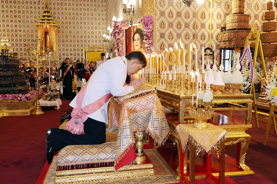 เมื่อเสด็จพระราชดำเนินถึงพระที่นั่งดุสิตมหาปราสาท พระบาทสมเด็จพระเจ้าอยู่หัว ทรงจุดธูปเทียนเครื่องราชสักการะทองลงยาราชาวดี และทรงจุดธูปเทียนเครื่องทองน้อย สมเด็จพระนางเจ้า ฯ พระบรมราชินี ทรงจุดธูปเทียนเครื่องราชสักการะทองลงยารอง และทรงจุดธูปเทียนเครื่องทองน้อยที่หน้าพระโกศพระบรมศพ สมเด็จพระนางเจ้าสิริกิติ์ พระบรมราชินีนาถ พระบรมราชชนนีพันปีหลวง จากนั้น พระบาทสมเด็จพระเจ้าอยู่หัว ทรงจุดธูปเทียนเครื่องนมัสการพานทองสองชั้นบูชาพระพุทธรูปประจำพระชนมวารที่หน้าพระแท่นพระนพปฎลมหาเศวตฉัตร ทรงกราบ แล้วประทับพระราชอาสน์ สมเด็จพระอริยวงศาคตญาณ สมเด็จพระสังฆราช สกลมหาสังฆปริณายก ถวายศีล