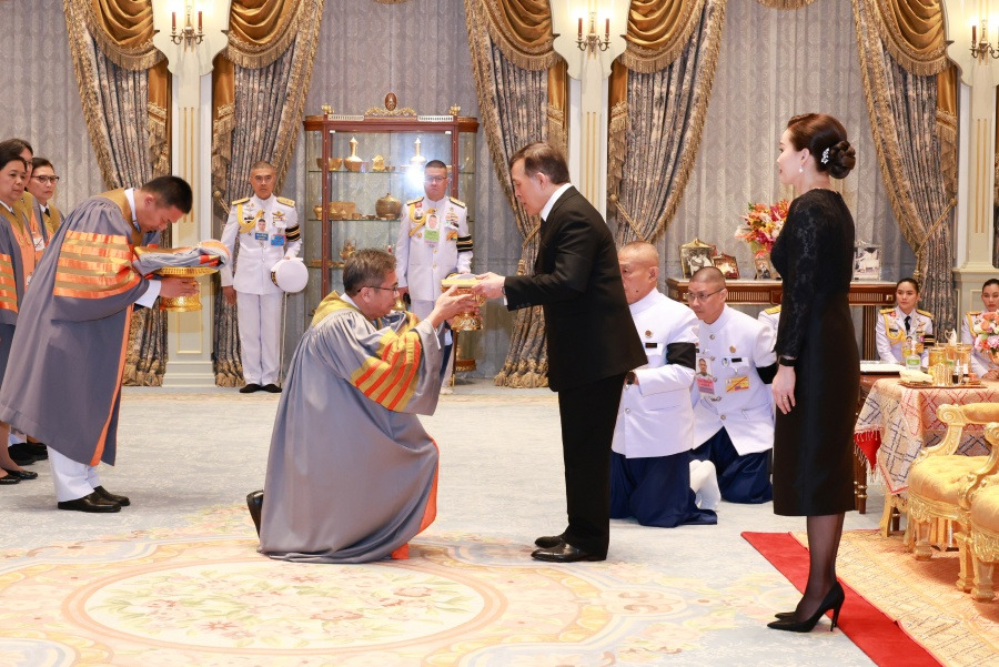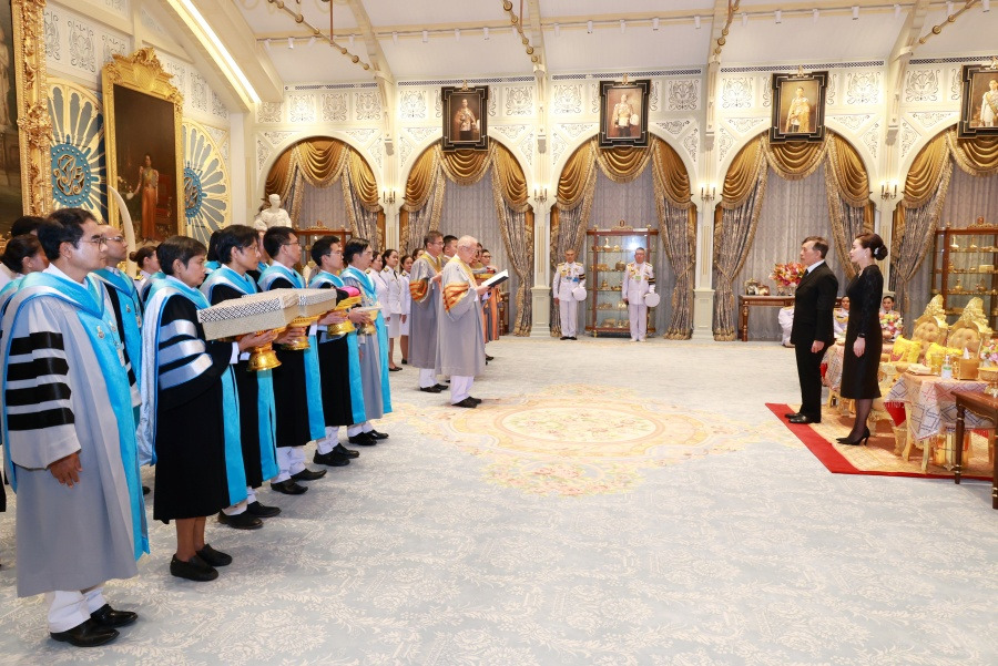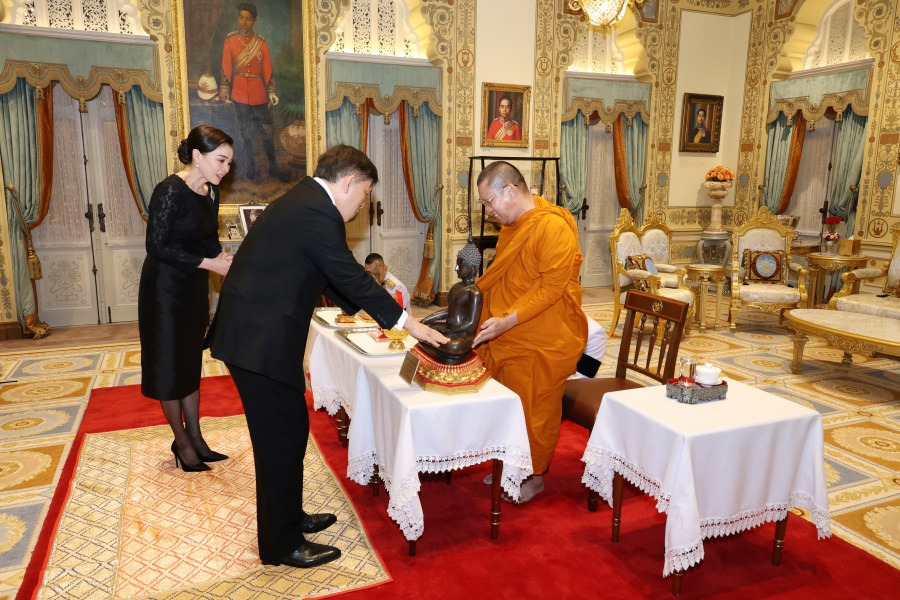 เนื้อสำริด ขนาดหน้าตัก 15 นิ้ว พระพุทธรูปปางลีลา ศิลปะสุโขทัย เนื้อว่านบุทองคำ ความสูง 3.5 นิ้ว และพระพุทธรูปปางมารวิชัย ศิลปะอยุธยา เนื้อบุทองคำ ขนาดหน้าตัก 1.5 นิ้ว แด่พระบาทสมเด็จพระเจ้าอยู่หัว และถวายพระพุทธรูปปางมารวิชัย ศิลปะสุโขทัย ยุคคลาสสิค เนื้อโลหะลงรักปิดทอง ขนาดหน้าตัก 8 นิ้ว พระพุทธรูปปางเปิดโลก ศิลปะสุโขทัย เนื้อว่านบุทอง ความสูง 3.5 นิ้ว และพระพุทธรูปปางนาคปรก ศิลปะลพบุรี เนื้อชิน ความสูง 1.5 นิ้ว แด่สมเด็จพระนางเจ้า ฯ พระบรมราชินี เนื่องในโอกาสขึ้นปีใหม่ พุทธศักราช 2569