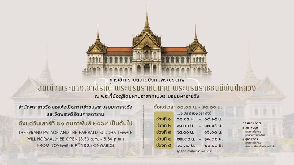 สำนักพระราชวัง ขอแจ้งเปลี่ยนแปลงเวลาเข้ากราบถวายบังคมพระบรมศพ สมเด็จพระนางเจ้าสิริกิติ์ พระบรมราชินีนาถ พระบรมราชชนนีพันปีหลวง ณ พระที่นั่งดุสิตมหาปราสาท ในพระบรมมหาราชวัง และเส้นทางเดินเยี่ยมชม สำหรับนักท่องเที่ยว ตั้งแต่วันเสาร์ที่ 21 กุมภาพันธ์ 2569 เป็นต้นไป