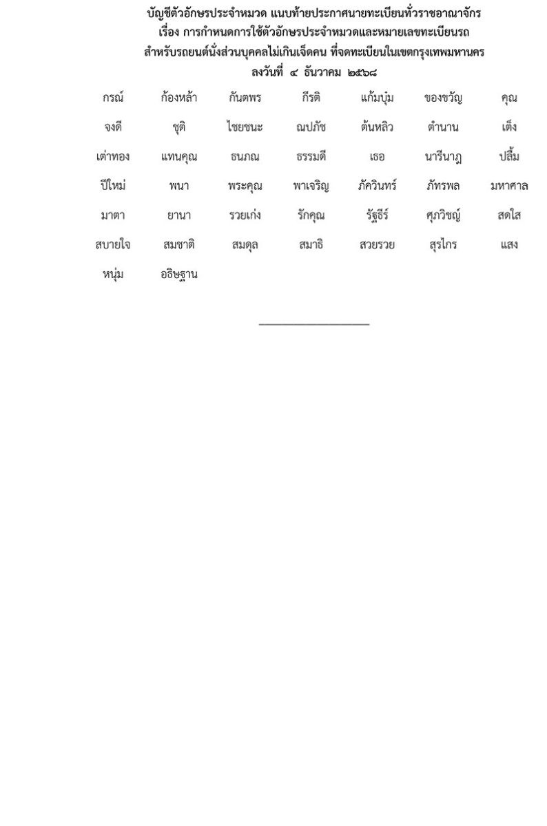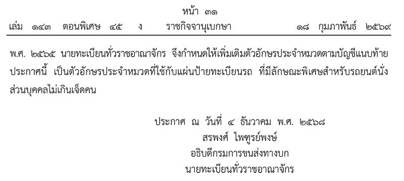โดยที่ประชาชนและสำนักงานกองทุนเพื่อความปลอดภัยในการใช้รถใช้ถนน ได้มีการเสนอตัวอักษร คำหรือข้อความที่จะใช้เป็นตัวอักษรประจำหมวดเพิ่มเติมจากที่กำหนดไว้ท้ายประกาศข้างต้น ประกอบกับคณะอนุกรรมการพิจารณาตัวอักษรประจำหมวดที่ใช้กับแผ่นป้ายทะเบียนรถที่มีลักษณะพิเศษ สำหรับรถยนต์นั่งส่วนบุคคลไม่เกินเจ็ดคน ในคราวการประชุม ครั้งที่ 3/2568 เมื่อวันที่ 12 พฤศจิกายน พ.ศ. 2568 ได้พิจารณาแล้ว มีมติเห็นชอบให้ใช้ตัวอักษรประจำหมวดเพิ่มเติมจำนวน 44 หมวด