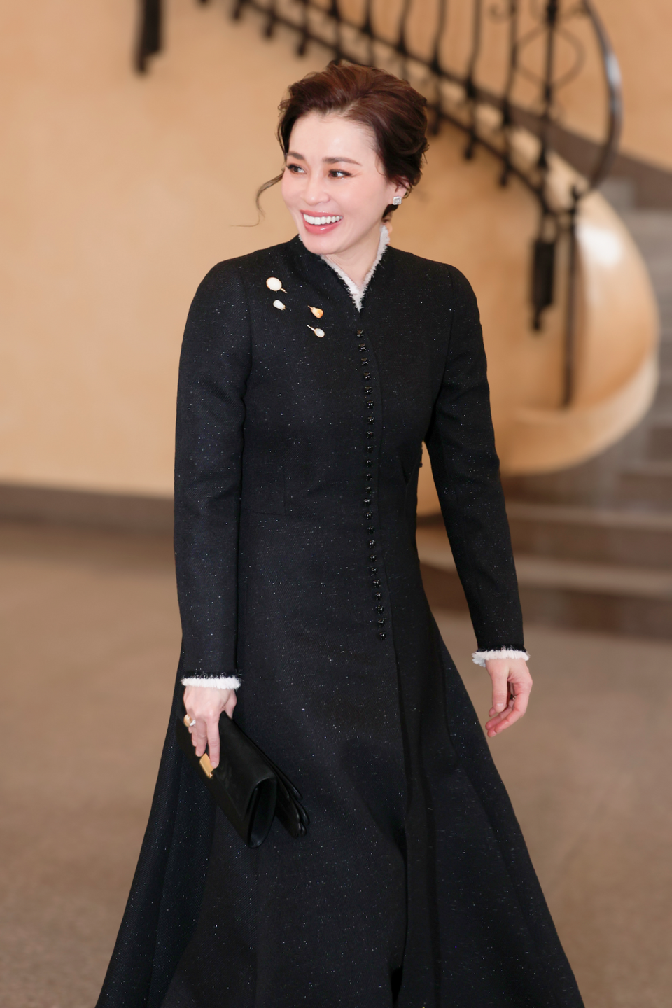 สำหรับฉลองพระองค์ของสมเด็จพระนางเจ้า ฯ พระบรมราชินี เป็นเสื้อทรงแจ็กเก็ตยาว ความยาวระดับพื้น แขนยาวสีดำ คอปีน โครงทรงบานชาย (A-Line) ผ้าวูลทอสอดดิ้น บุด้านในด้วยผ้าไหมทอยกลาย พระดุม (กระดุม) เป็นวัสดุนิลทรงรีตัวเรือนเงิน เรียงชิดกันด้านหน้าเสื้อทรง ปลายแขนและคอตกแต่งผ้าไหมชายครุยผ้าไหมสีครีม ใส่คู่กับพระสนับเพลาทรงขาตรงสีดำ”กระเป๋าทรง“ หนังวัวสีดำ ฉลองพระบาทบูทข้อเท้าสีดำ เครื่องประดับเป็นโอปอลคู่ทรงรี สำหรับกลัดช่วงอก (Jabot Pins) ตัวเรือนทอง แหวนอะพาไทต์ตาแมวล้อมเพชร ตัวเรือนทอง โทนอ่อนตัดกับสีดำ