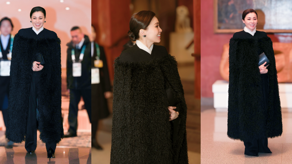 สำหรับฉลองพระองค์เป็นแจ็กเก็ตสีดำแขนยาว คอวี ผ้าวูล โครงเข้ารูป พระดุม (กระดุม) วัสดุนิลทรงครึ่งวงกลมขนาดใหญ่ฐานเงิน สวมคลุมด้วยเคปยาวผ้าขนแกะเทียมสีดำ ความยาวระดับข้อพระบาท (ข้อเท้า) ใส่คู่กับพระสนับเพลา (กางเกง) ขาตรง ผ้าวูลสีดำ พระกระเป๋าหนังสีดำ และฉลองพระบาท (รองเท้า) บูทส้นสูงสีดำ เครื่องประดับเป็นพระกุณฑล (ต่างหู) แซฟไฟร์หลังเบี้ย (Cabochon) ล้อมเพชร และพระธำมะรงค์ (แหวน) แซฟไฟร์หลังเบี้ย ตัวเรือนเงิน โทนน้ำเงินตัดกับสีดำ