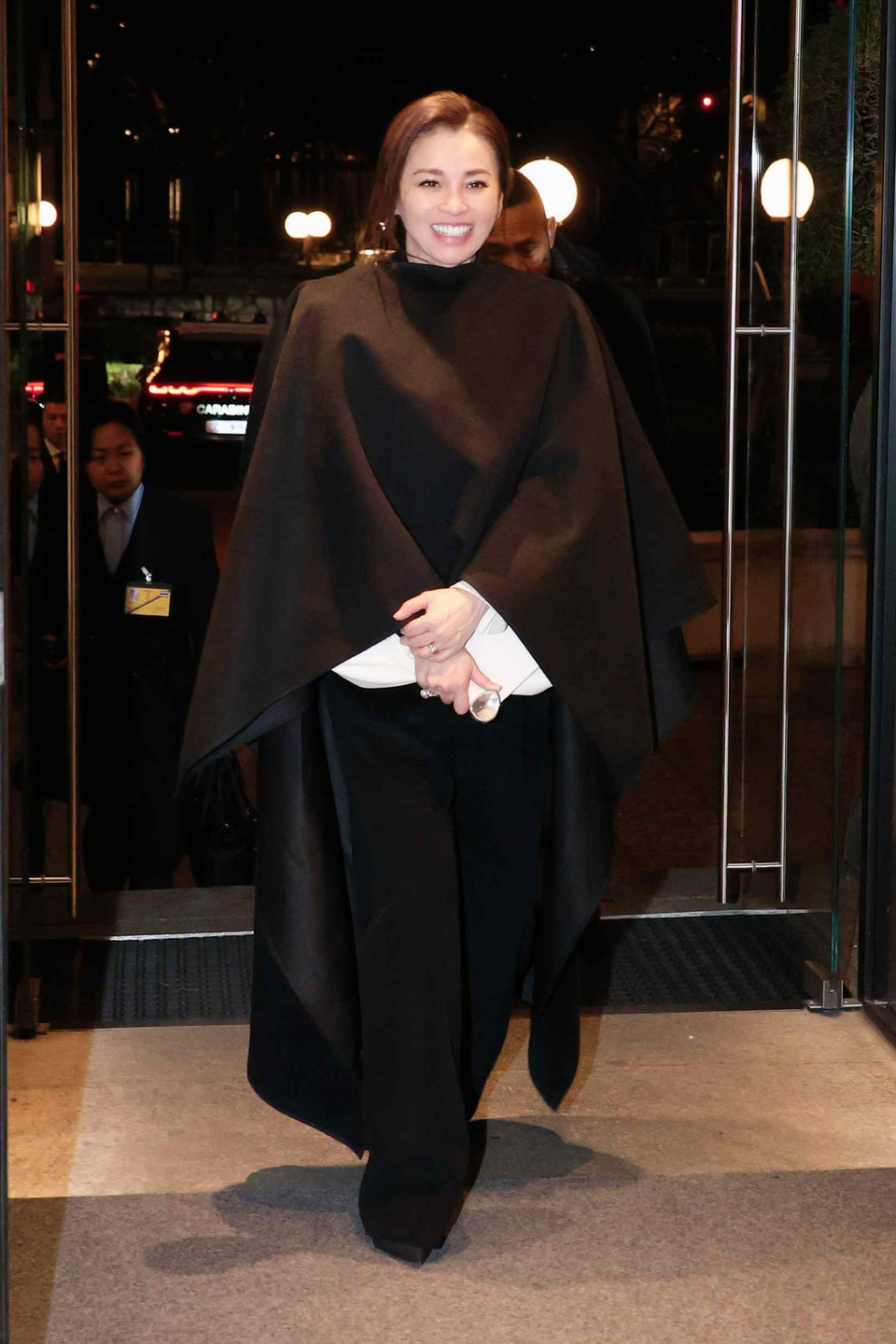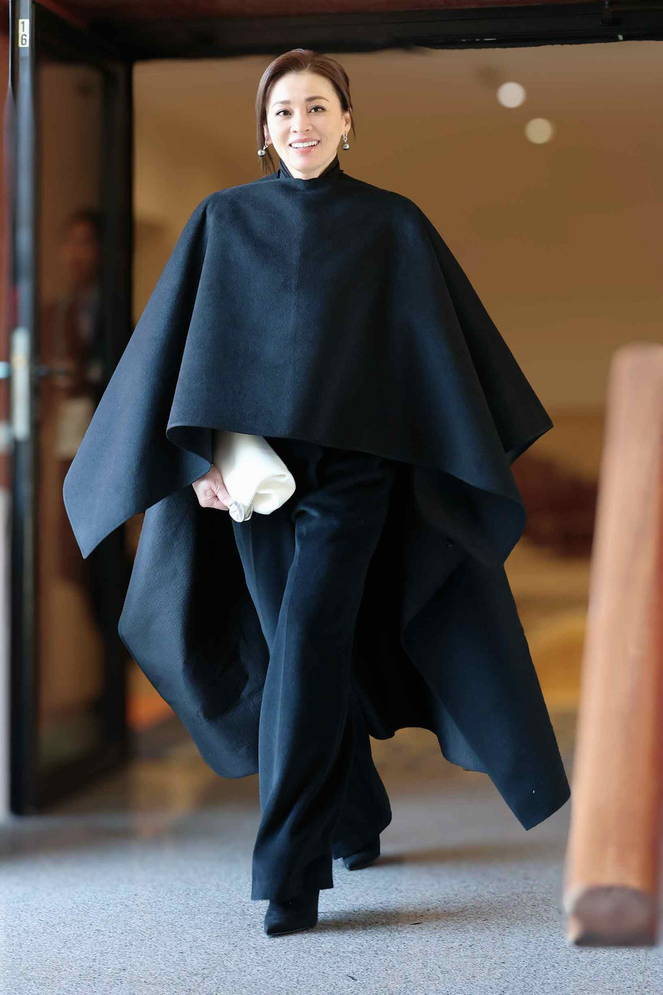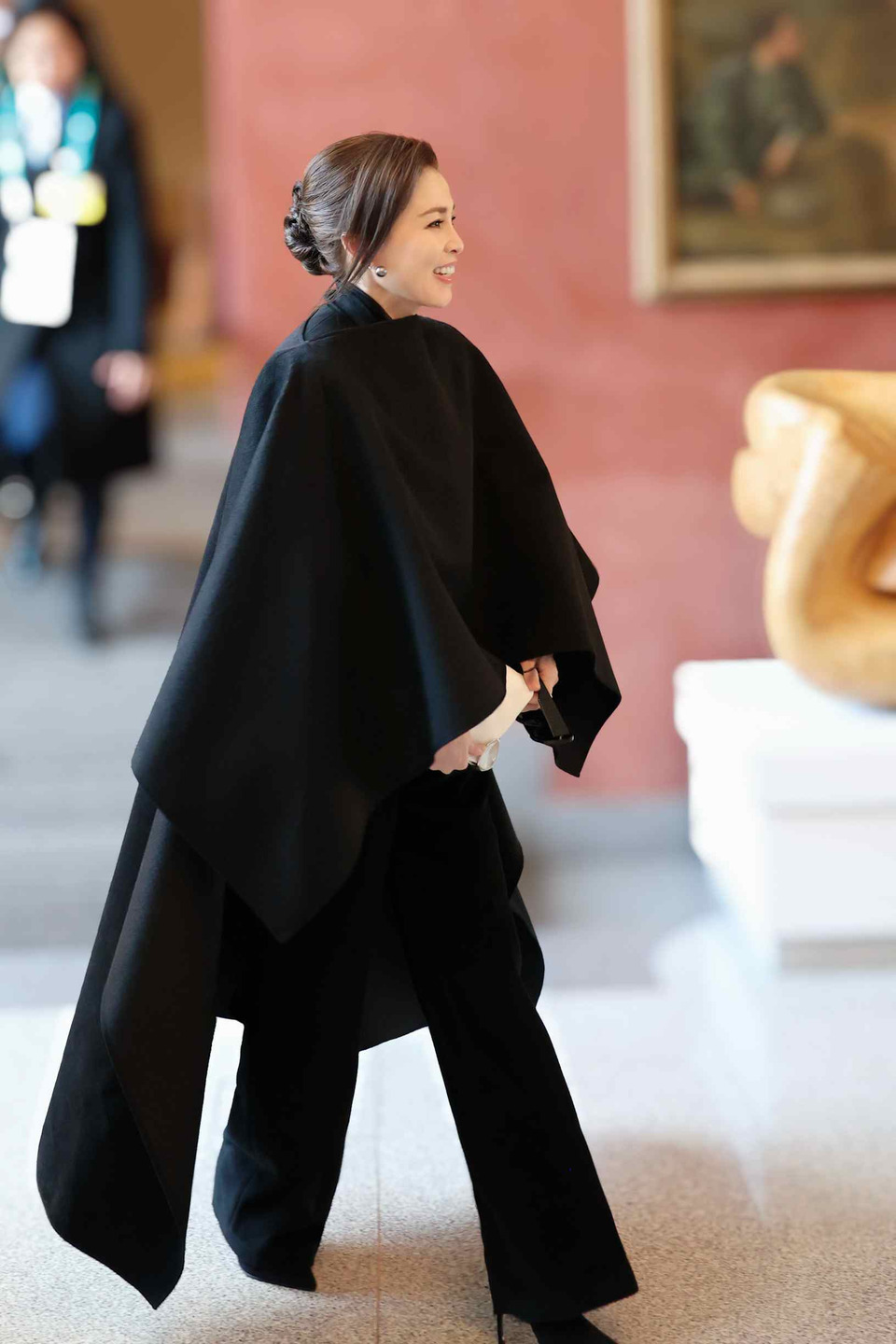 สำหรับฉลองพระองค์ในวันนี้เป็น “เสื้อทรง” แจ็กเก็ตตัวครอปแขนยาวสีดำ คอกลม ผ้าวูล พระดุมนิลทรงโค้งฐานเงินรมดำเรียงด้านหน้า ปลายแขนตกแต่งด้วยผ้าไหมสีขาว ใส่คู่กับพระสนับเพลาทรงตรงเอวสูงสีดำ สวมคลุมด้วยผ้าคลุมไหล่ยาว สีดำ ผ้าวูลผสมผ้าไหมทอยกลาย ทรงปล่อยชายแบบอสมมาตร พระกระเป๋าหนังสีดำ ฉลองพระบาทเรียบสีดำ พระกุณฑลไข่มุกตาฮิติสีเทา (Tahitian Pearls) ตัวเรือนเงินฝังเพชร และพระธำมรงค์ไข่มุกเซาท์ซีล้อมเพชร ตัวเรือนทองคำขาว โทนเทาตัดกับสีดำ