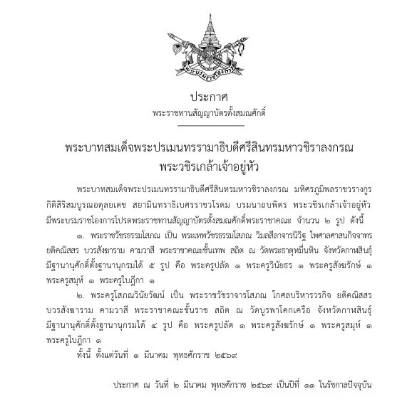 วันที่ 2 มี.ค.69 เว็บไซต์ราชกิจจานุเบกษา เผยแพร่ประกาศเล่มที่ 143 ตอนที่ 10 ข เรื่องประกาศพระราชทานสัญญาบัตรตั้งสมณศักดิ์ ความว่า พระบาทสมเด็จพระปรเมนทรรามาธิบดีศรีสินทรมหาวชิราลงกรณ พระวชิรเกล้าเจ้าอยู่หัว มีพระบรมราชโองการโปรดพระราชทานสัญญาบัตรตั้งสมณศักดิ์พระราชาคณะ จำนวน 2 รูป ดังนี้