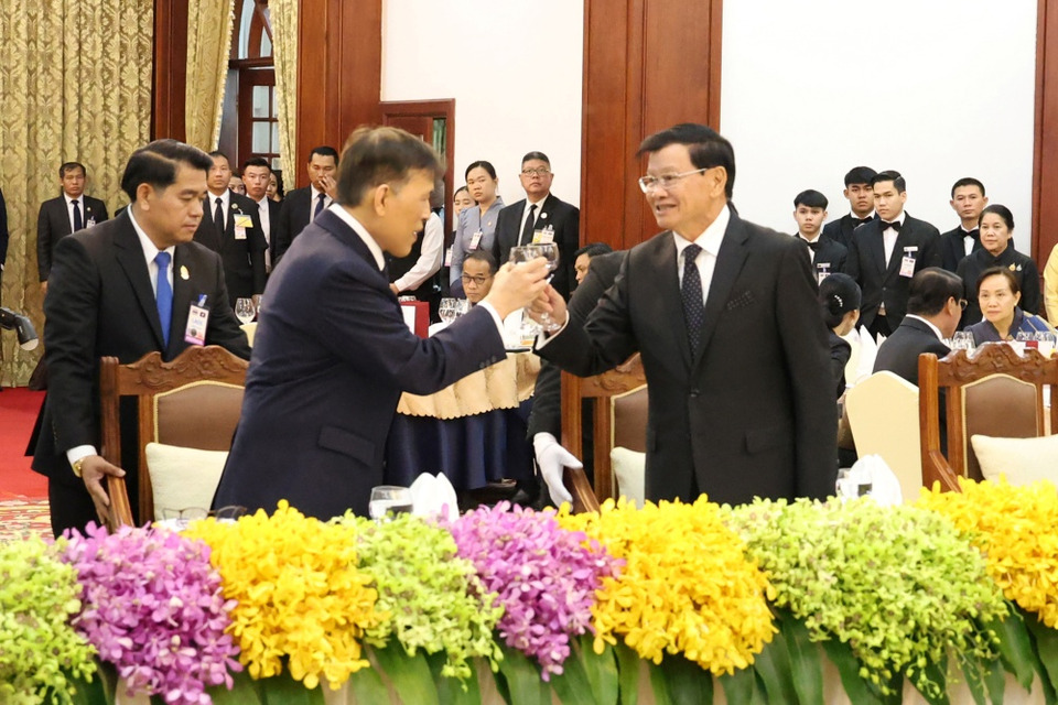 ในโอกาสนี้ ประธานประเทศ กล่าวสุนทรพจน์ และเชิญชวนแขกผู้มีเกียรติดื่มถวายพระพรชัยมงคลแด่พระบาทสมเด็จพระเจ้าอยู่หัว และสมเด็จพระนางเจ้า ฯ พระบรมราชินี จากนั้น พระบาทสมเด็จพระเจ้าอยู่หัว พระราชทานพระราชดำรัส และเชิญชวนแขกผู้มีเกียรติดื่มอวยพรแก่ประธานประเทศ และภริยา ในการนี้ ทอดพระเนตรการแสดงทางวัฒนธรรมที่ฝ่ายลาวจัดถวาย เมื่อจบการแสดง พระราชทานกระเช้าดอกไม้แก่ กลุ่มนักแสดง ตามธรรมเนียมของฝ่ายลาว สมควรแก่เวลา พระบาทสมเด็จพระเจ้าอยู่หัว และสมเด็จพระนางเจ้า ฯ พระบรมราชินี จึงเสด็จพระราชดำเนินออกจากห้องถวายเลี้ยงพระกระยาหารค่ำอย่างเป็นทางการ พร้อมด้วยประธานประเทศ และภริยา ไปประทับรถยนต์พระที่นั่ง เสด็จพระราชดำเนินกลับโรงแรมที่ประทับ