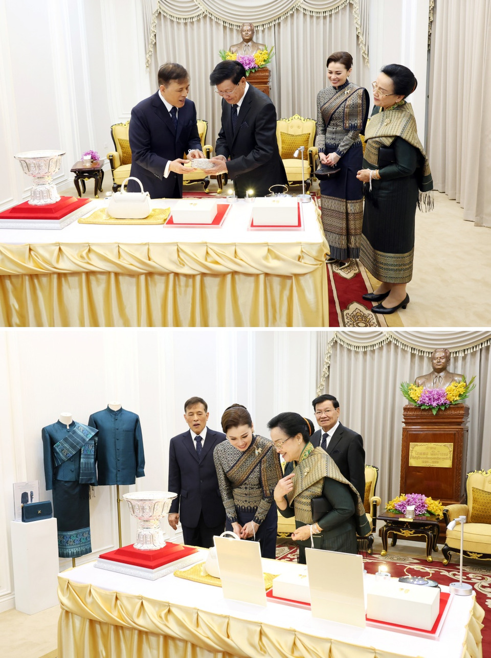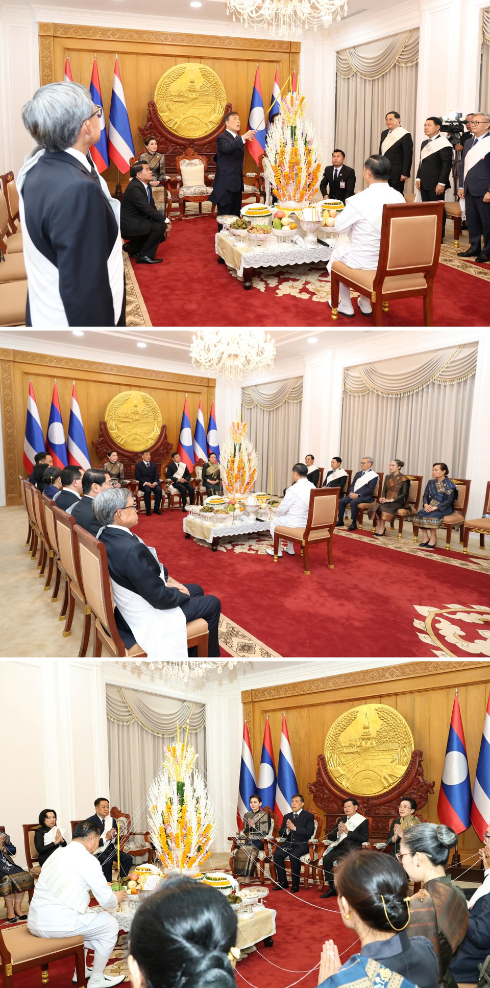 จากนั้น พระราชทานพระบรมราชวโรกาสให้ หมอพร เฝ้าทูลละอองธุลีพระบาท ทูลเกล้าทูลกระหม่อมถวายไข่ขวัญ และขอพระราชทานพระบรมราชานุญาตผูกสายสิญจน์ที่ข้อพระหัตถ์ซ้ายพระบาทสมเด็จพระเจ้าอยู่หัว และผูกสายสิญจน์ที่ข้อพระหัตถ์ซ้ายสมเด็จพระนางเจ้า ฯ พระบรมราชินี จากนั้น พระราชทานพระบรมราชานุญาตให้ ประธานประเทศผูกสายสิญจน์ที่ข้อพระหัตถ์ซ้ายพระบาทสมเด็จพระเจ้าอยู่หัว และภริยาประธานประเทศ ขอพระราชทานพระบรมราชานุญาตผูกสายสิญจน์ที่ข้อพระหัตถ์ซ้ายสมเด็จพระนางเจ้า ฯ พระบรมราชินี เสร็จแล้ว เสด็จพระราชดำเนินไปยังห้องเฝ้า พระราชทานพระบรมราชวโรกาสให้ ประธานประเทศ และภริยา เฝ้า ถวายของขวัญ เป็นพานเงิน กระเป๋าและชุดผ้าไหมลาว ในโอกาสนี้ พระบาทสมเด็จพระเจ้าอยู่หัว และสมเด็จพระนางเจ้า ฯ พระบรมราชินี พระราชทานของขวัญ เป็นกล่องเงิน และกระเป๋าย่านลิเภา แด่ประธานประเทศ และภริยา