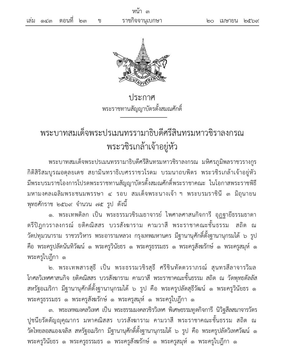 พระบาทสมเด็จพระปรเมนทรรามาธิบดีศรีสินทรมหาวชิราลงกรณ มหิศรภูมิพลราชวรางกูร กิติสิริสมบูรณอดลยเดช สยามินทราธิเบศรราราชวโรดม บรมนาถบพิตร พระวชิรเกล้าเจ้าอยู่หัว มีพระบรมราชโองการโปรดพระราชทานสัญญาบัตรตั้งสมณศักดิ์พระราชาคณะ ในโอกาสพระราชพิธี มหามงคลเฉลิมพระชนมพรรษา 4 รอบ สมเด็จพระนางเจ้า ฯ พระบรมราชินี 3 มิถุนายน พุทธศักราช 2569 จำนวน 75 รูป ดังนี้