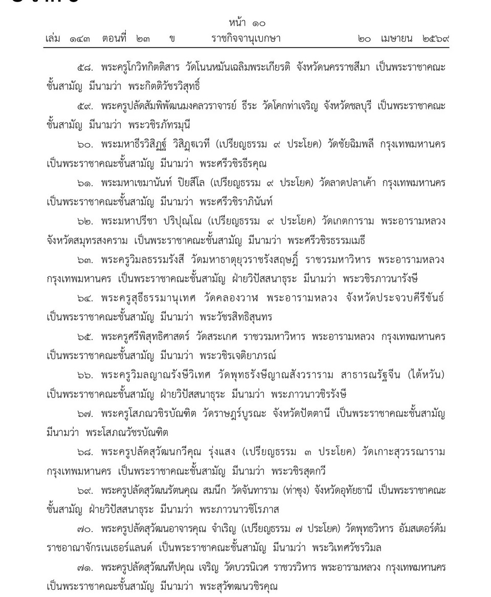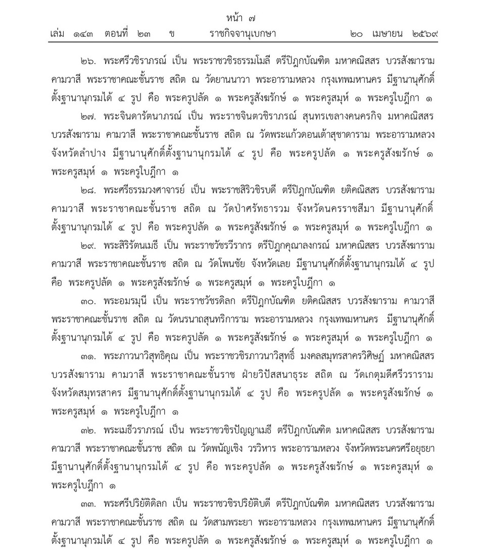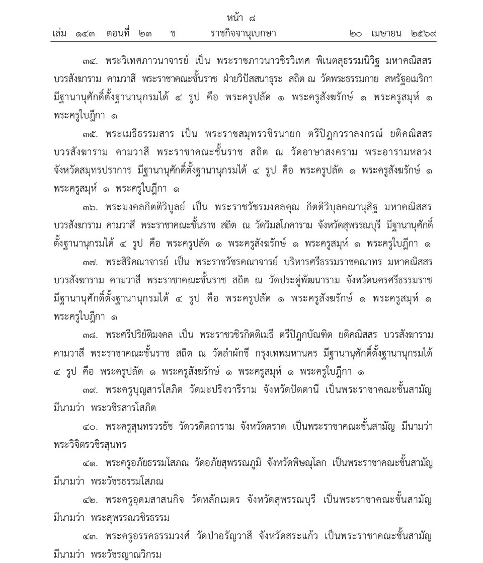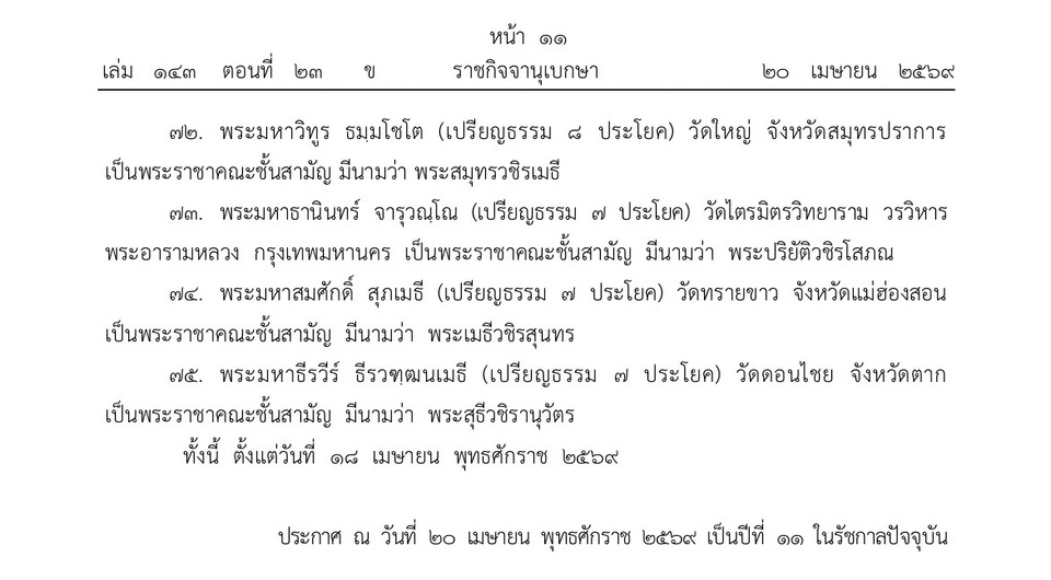 วันที่ 21 เม.ย.69 เว็บไซต์ราชกิจจานุเบกษา เผยแพร่ประกาศ พระราชทานสัญญาบัตรตั้งสมณศักดิ์