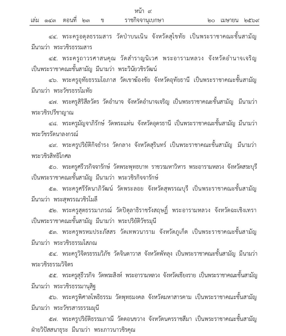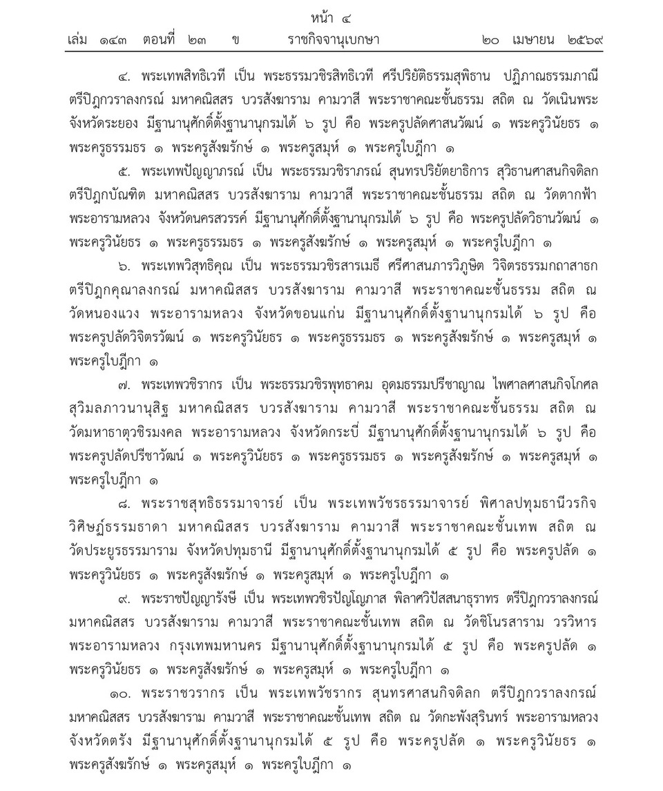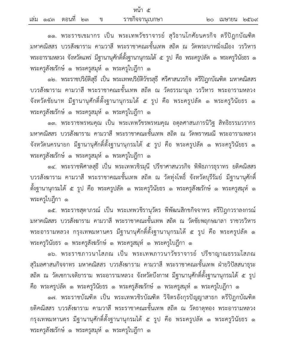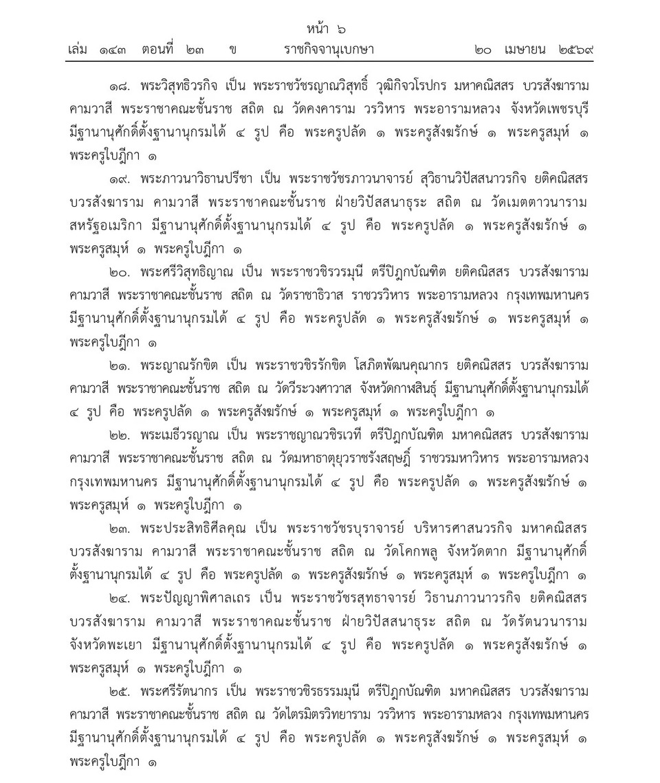 วันที่ 21 เม.ย.69 เว็บไซต์ราชกิจจานุเบกษา เผยแพร่ประกาศ พระราชทานสัญญาบัตรตั้งสมณศักดิ์