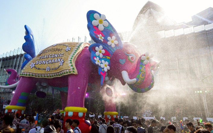 ด้านเมืองสุขสยาม ได้มอบความสนุกในเทศกาลสงกรานต์ไม่แพ้กัน กับอุโมงค์น้ำช้างพ่นน้ำฉ่ำเย็นชื่นใจ บริเวณบ่อน้ำภาคใต้ ประกอบ แสง สี เสียง รื่นรมย์เพลงสงกรานต์บ้านเรา นอกจากนี้ประชาชนได้มาร่วมสรงน้ำพระ“หลวงพ่อเงิน” เป็นพระพุทธรูปเงิน ปางมารวิชัย ศิลปะเชียงแสนล้านช้าง พระพุทธรูปศักดิ์สิทธิ์โบราณ คู่บ้านคู่เมือง อายุกว่า 700 ปี จากวัดปากน้ำ (บุ่งสระพัง) จังหวัดอุบลราชธานี รวมถึงสรงน้ำขอพร พระอุปคุต และพระประจำวันเกิด กันอย่างต่อเนื่อง
