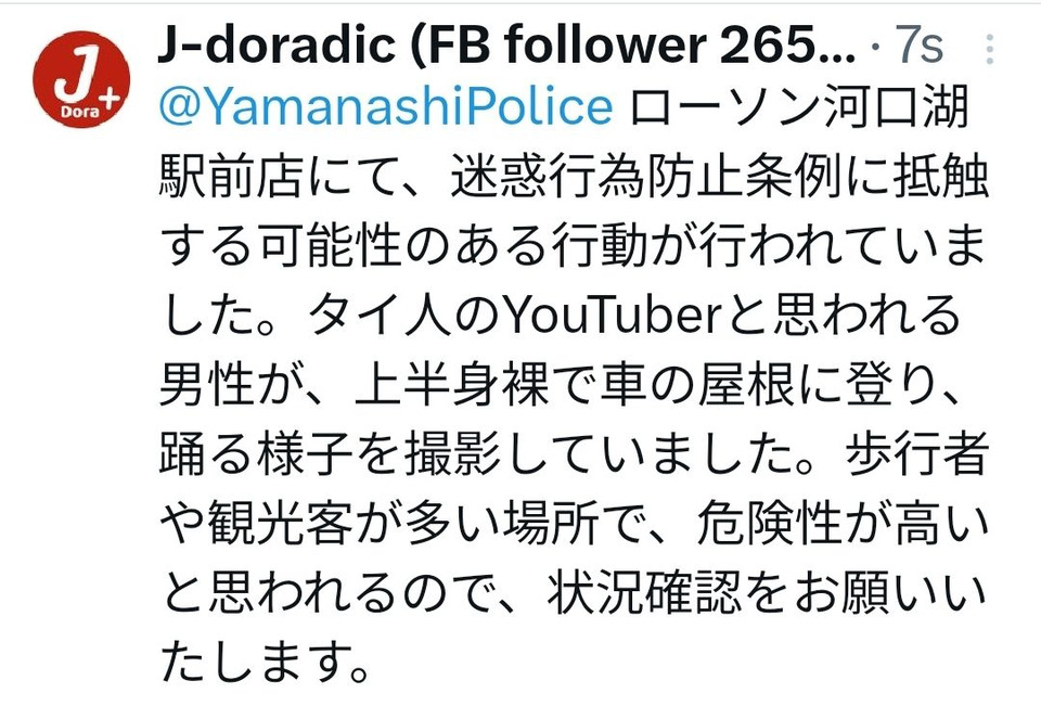 "ที่บริเวณหน้าร้าน Lawson สถานีคาวากุจิโกะ มีพฤติกรรมที่อาจเข้าข่ายละเมิดความผิดฐาน "ฝ่าฝืนข้อห้ามทำพฤติกรรมรบกวนในที่สาธารณะ" จากชายคนหนึ่งซึ่งคาดว่าเป็นยูทูบเบอร์ชาวไทย เขาทั้งถอดเสื้อและปีนขึ้นไปบนหลังคารถ พร้อมทั้งถ่ายคลิปขณะเต้นอยู่บนหลังคารถ พื้นที่ดังกล่าวมีผู้คนและนักท่องเที่ยวจำนวนมาก ทำให้มีความเสี่ยงอันตรายสูง จึงขอความกรุณาคุณตำรวจช่วยตรวจสอบสถานการณ์ด้วยครับ"