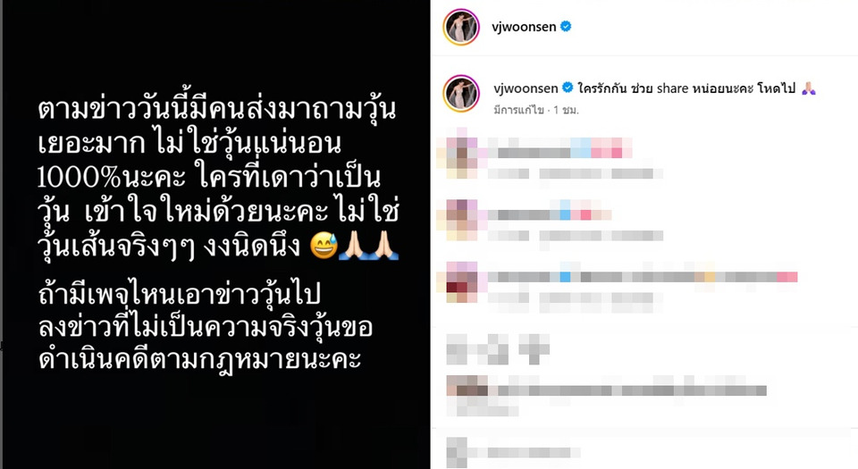 ล่าสุด วุ้นเส้น วิริฒิพา ได้ออกมาแจงทันทีผ่านอินสตาแกรมส่วนตัวว่า "ตามข่าววันนี้มีคนส่งมาถามวุ้นเยอะมาก ไม่ใช่วุ้นแน่นอน1000% นะคะ ใครที่เดาว่าเป็นวุ้น เข้าใจใหม่ด้วยนะคะ ไม่ใช่วุ้นเส้นจริงๆ งงนิดนึง ถ้ามีเพจไหนเอาข่าววุ้นไปลงข่าวที่ไม่เป็นความจริง วุ้นขอดำเนินคดีตามกฎหมายนะคะ"