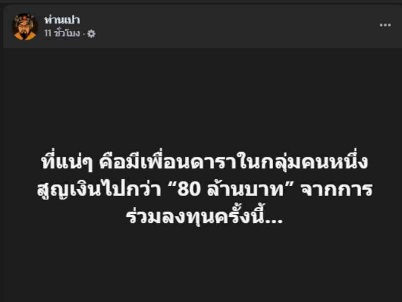 "ที่แน่ๆ คือมีเพื่อนดาราในกลุ่มคนหนึ่ง สูญเงินไปกว่า “80 ล้านบาท” จากการร่วมลงทุนครั้งนี้…"