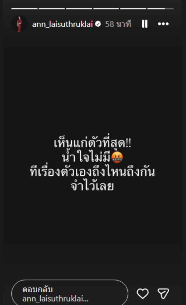 ส่วน "แอน อลิชา" โพสต์ข้อความผ่านอินสตาแกรมสตอรี่ @ann_laisuthruklai ระบุว่า...