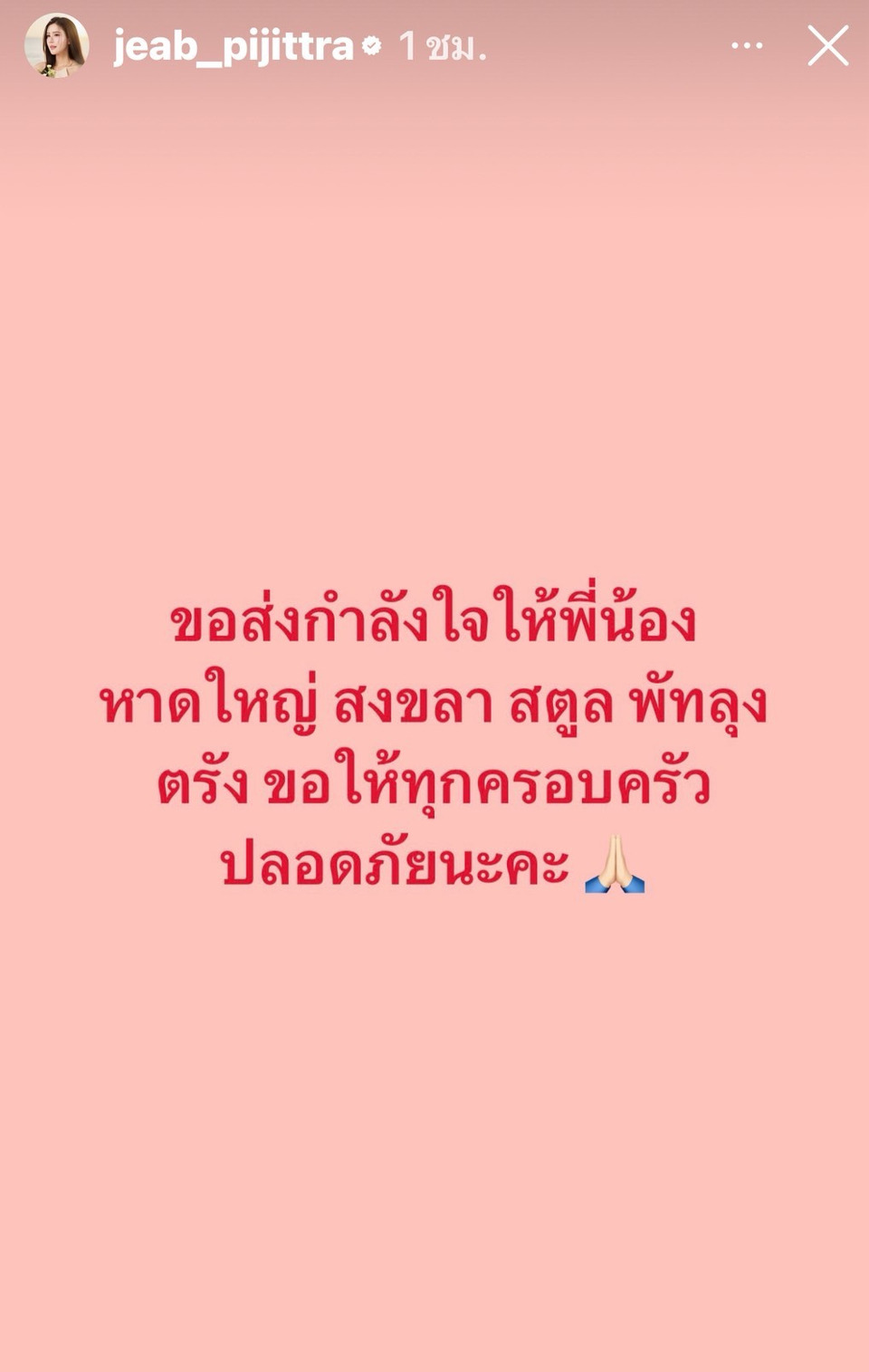 เจี๊ยบ พิจิตตรา ได้ส่งข้อความให้กำลังใจผ่านบัญชี @jeab_pijittra ระบุว่า...“ขอส่งกำลังใจให้พี่น้อง หาดใหญ่ สงขลา สตูล พัทลุง ตรัง ขอให้ทุกครอบครัวปลอดภัยนะคะ 🙏🏼💙”
