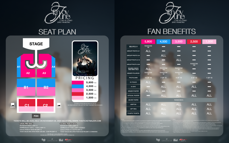 งานนี้สองสาว “เอนจอย-จูน” การันตีว่าพร้อมเสิร์ฟโชว์สุดเอ็กซ์คลูซีฟ และโมเมนต์สุดฟินให้ได้ฮ็อปกันอย่างเต็มที่แน่นอน โดยจะเริ่มจำหน่ายบัตรในวันเสาร์ที่ 29 พฤศจิกายน นี้ทาง www.thaiticketmajor.com ราคาบัตร: 5,800 / 4,500 / 3,500 / 2,500 และ 1,500 บาท สำหรับรอบการจำหน่ายบัตรนั้นมี 2 รอบเวลาดังนี้ รอบ LOCAL PRE-SALE: เวลา 10:00 - 12:00 น. และ รอบ GLOBAL PUBLIC SALE: เวลา 14:00 น. เป็นต้นไป