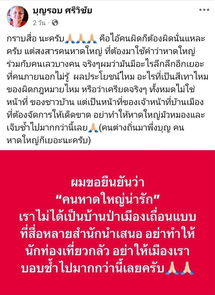 พร้อมเขียนแคปชั่นว่า "กราบสื่อ นะครับ คือไอ้คนผิดก็ต้องผิดนั่นแหละครับ แต่สงสารคนหาดใหญ่ ที่ต้องมาใช้คำว่าหาดใหญ่ร่วมกับคนเลวบางคน จริงๆ ผมว่ามันมีอะไรลึกลึกอีกเยอะ ที่คนภายนอกไม่รู้ ผลประโยชน์ไหม อะไรที่เป็นสีเทาไหม ของผิดกฎหมายไหม หรือว่าเครียดจริงๆ ทั้งหมดไม่ใช่หน้าที่ของชาวบ้าน แต่เป็นหน้าที่ของเจ้าหน้าที่บ้านเมืองที่ต้องจัดการให้เด็ดขาด อย่าทำให้หาดใหญ่มัวหมองและเจ็บช้ำไปมากกว่านี้เลย (คนต่างถิ่นมาพึ่งบุญ คนหาดใหญ่ก็เยอะนะครับ)"