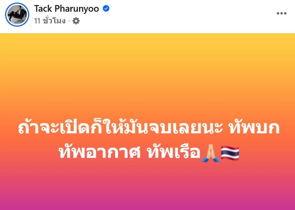 ล่าสุดวันนี้ (8 ธ.ค.68) นักแสดงดัง "แทค ภรัณยู" ได้ออกมาโพสต์ข้อความว่า “ถ้าจะเปิดก็ให้มันจบเลยนะ ทัพบก ทัพอากาศ ทัพเรือ” และโพสต์ในคอมเมนต์อีกว่า “ให้มันจบๆ ไป”