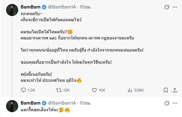 แบมแบมเผยว่า เจ้าตัวทราบข่าวว่ามีแฟนคลับจำนวนมากเตรียมเปิดไฟเพื่อเป็นกำลังใจระหว่างโชว์ของเขา แต่ด้วยกติกาของงานพิธีเปิดที่ต้องคุมแสงควบคุมไลท์ติ้งอย่างเข้มงวดเพื่อความสมบูรณ์ของการแสดง จึงอยากให้แฟนๆ ช่วยกันงดใช้ไฟในช่วงเวลาที่เขาขึ้นโชว์ โดยบอกอย่างอ่อนโยนว่าแม้ไม่ได้เห็นแสง แต่ “กำลังใจส่งถึงกันแน่นอน”