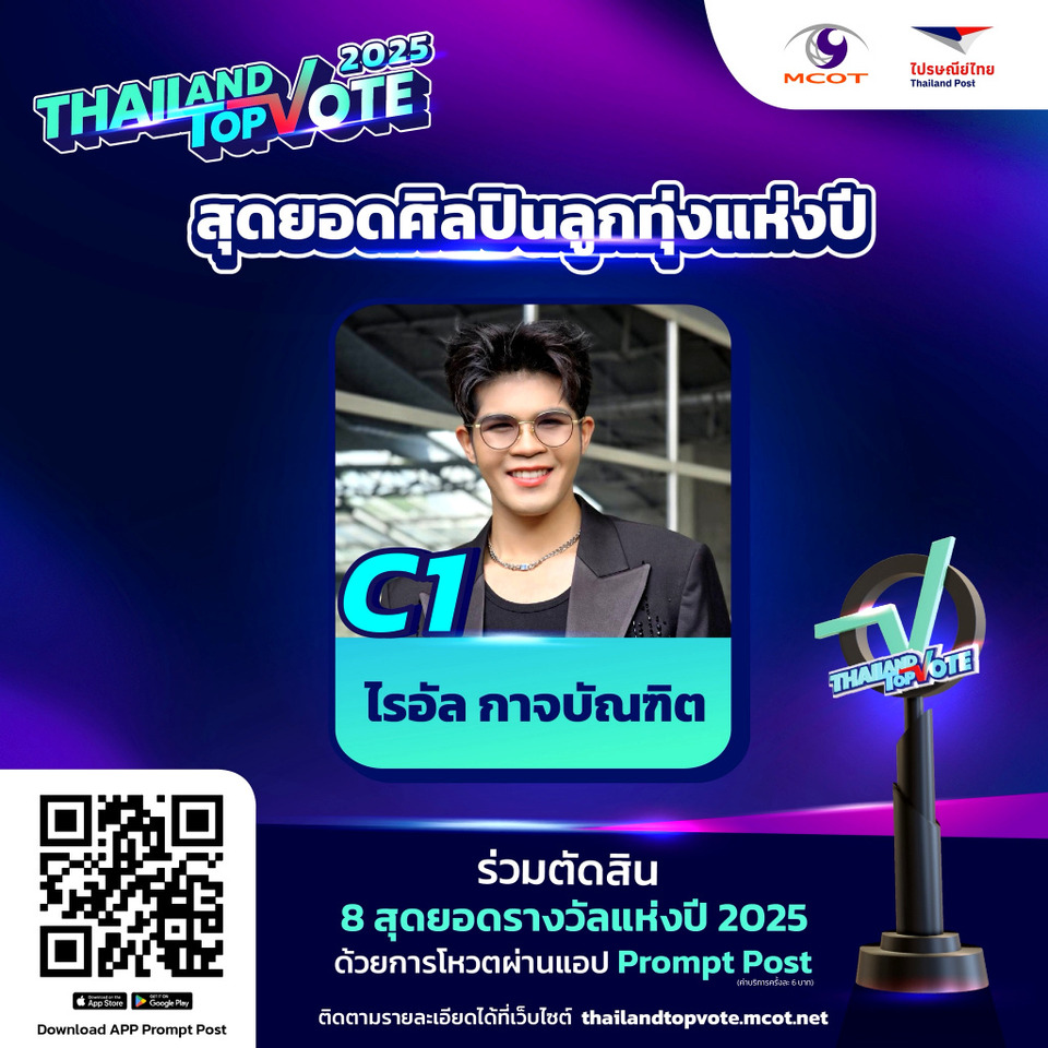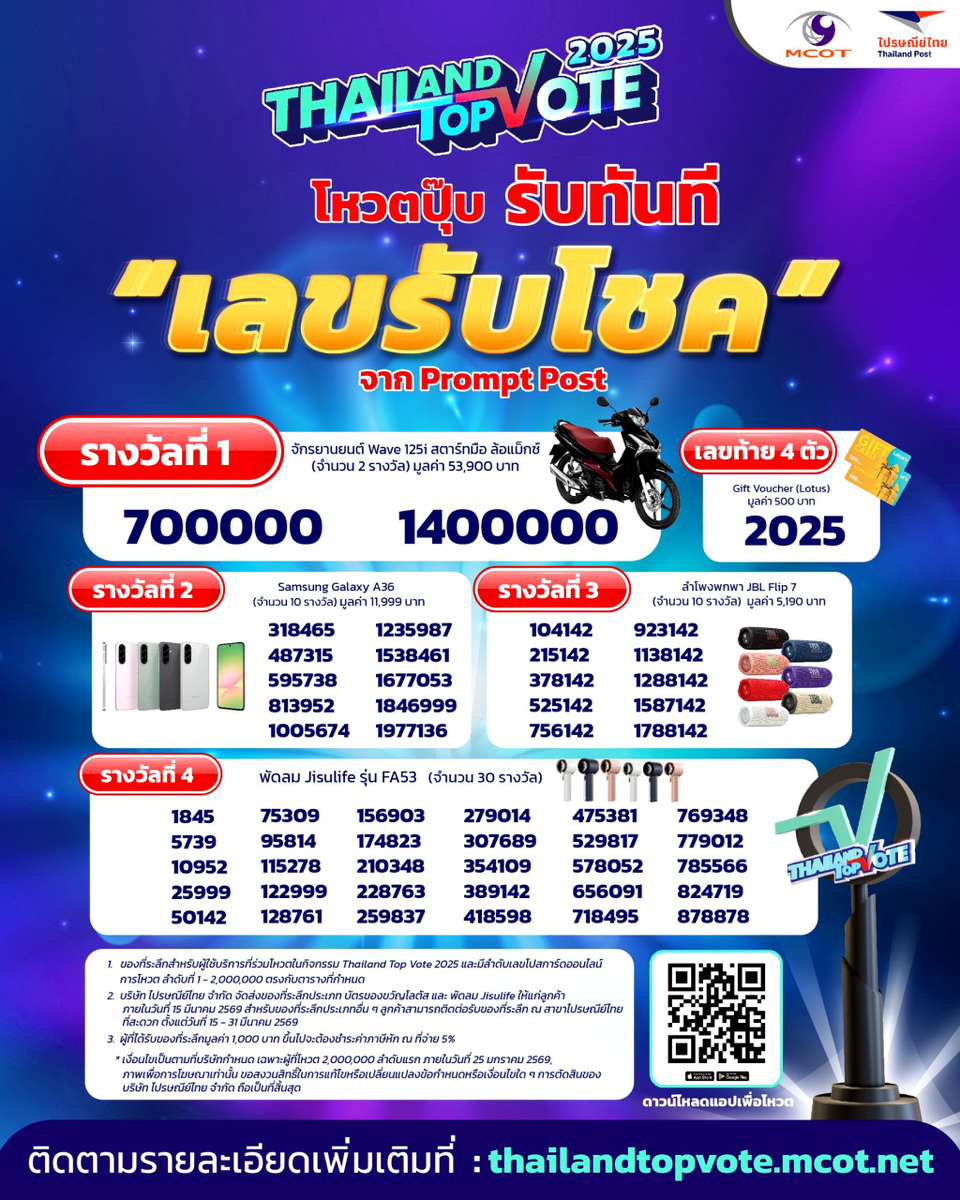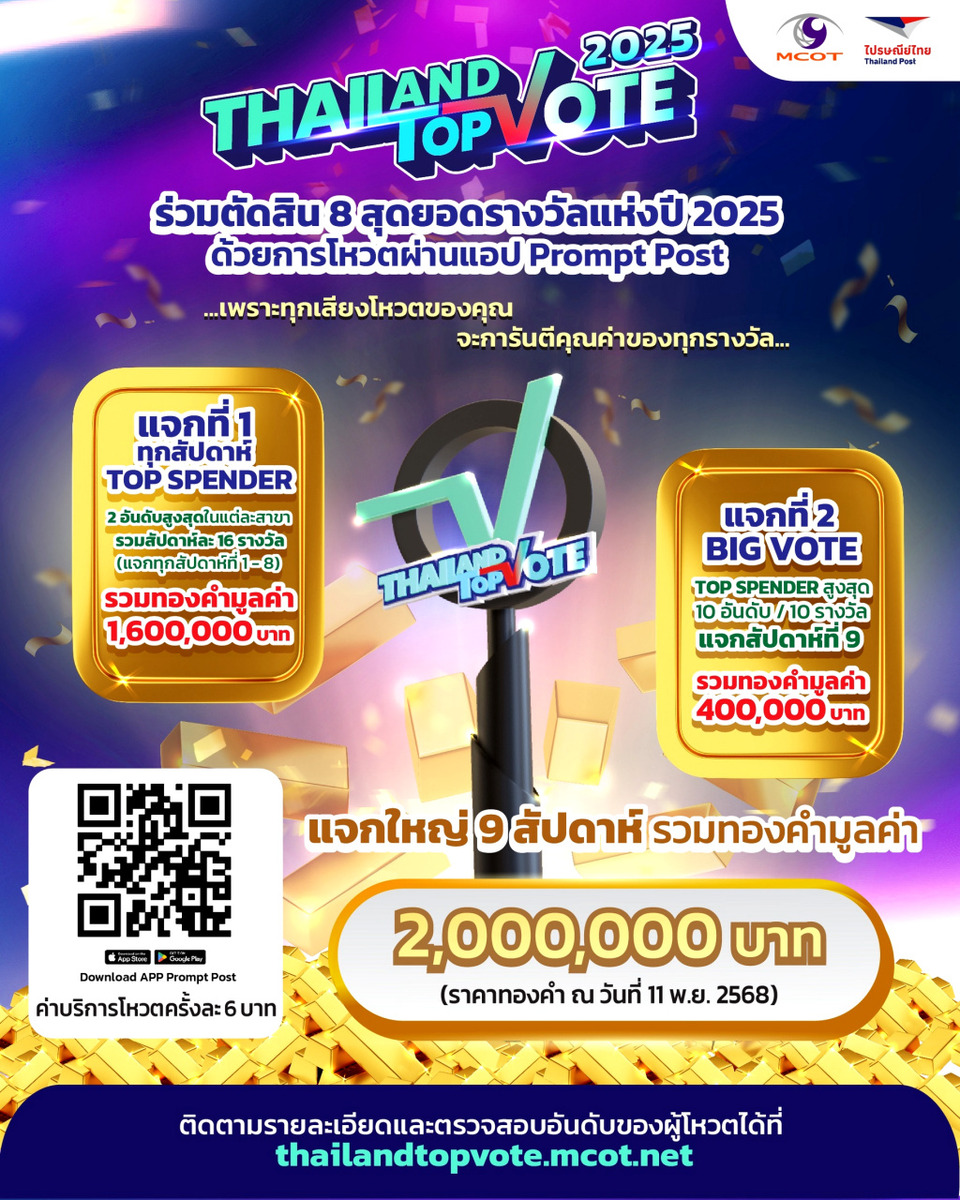 สามารถติดตามกติกาเพิ่มเติมและร่วมเป็นส่วนหนึ่งของรางวัล “Thailand Top Vote 2025” ได้ทาง https://thailandtopvote.mcot.net/ #ThailandTopVote2025 #MCOT #ช่อง9กด30 #ไปรษณีย์ไทย #PromptPost