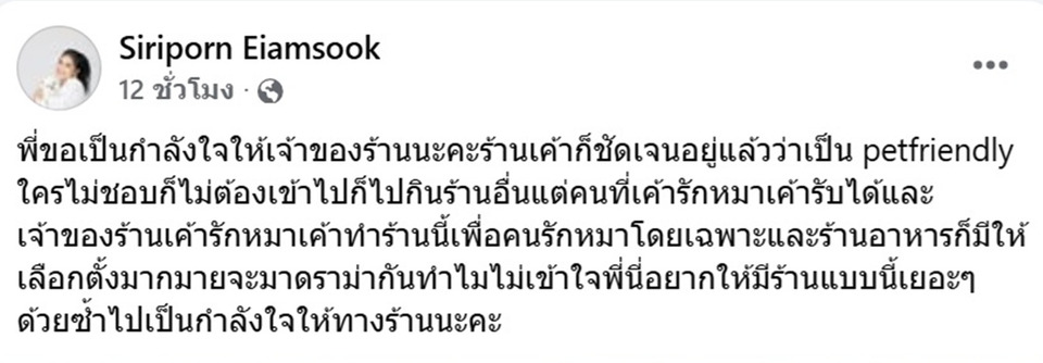 ล่าสุด “ตั๊ก ศิริพร” ได้ออกมาโพสต์ข้อความผ่านอินสตาแกรมส่วนตัวถึงกรณีดังกล่าวว่า “พี่ขอเป็นกำลังใจให้เจ้าของร้านนะคะร้านเขาก็ชัดเจนอยู่แล้วว่าเป็น petfriendly ใครไม่ชอบก็ไม่ต้องเข้าไปก็ไปกินร้านอื่นแต่คนที่เขารักหมาเขารับได้และเจ้าของร้านเขารักหมาเขาทำร้านนี้เพื่อคนรักหมาโดยเฉพาะและร้านอาหารก็มีให้เลือกตั้งมากมายจะมาดราม่ากันทำไม ไม่เข้าใจพี่นี่อยากให้มีร้านแบบนี้เยอะๆด้วยซ้ำไป เป็นกำลังใจให้ทางร้านนะคะ”