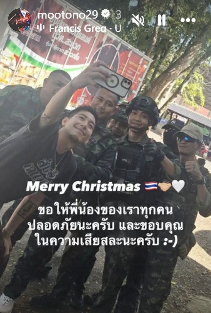 ล่าสุด "โตโน่ ภาคิน" ออกมาเคลื่อนไหวไอจีสตอรี่ @mootono29 โพสต์ภาพขณะที่เซลฟี่กับกลุ่มเจ้าหน้าที่ทหารที่กำลังปฏิบัติหน้าที่ พร้อมข้อความระบุว่า “Merry Christmas ขอให้พี่น้องของเราทุกคน ปลอดภัยนะครับ และขอบคุณ ในความเสียสละนะครับ”