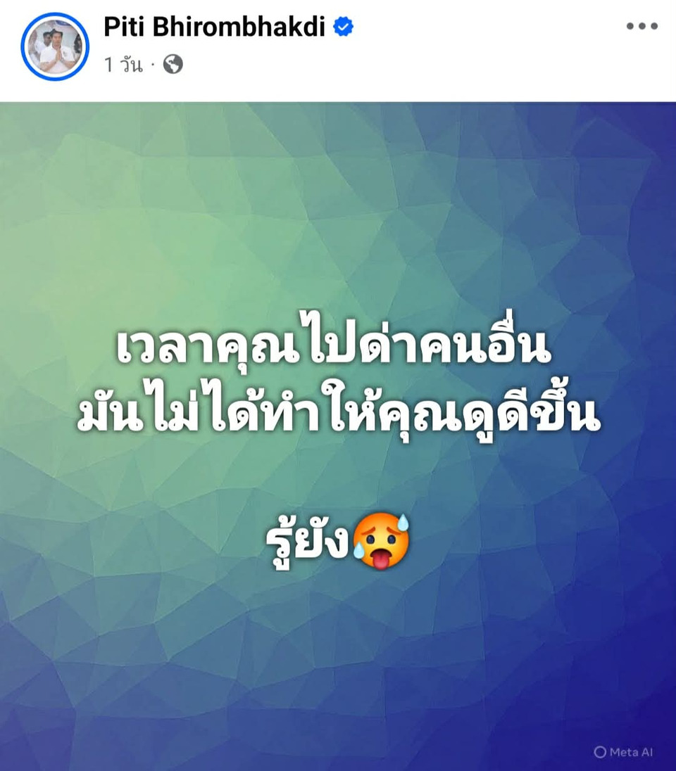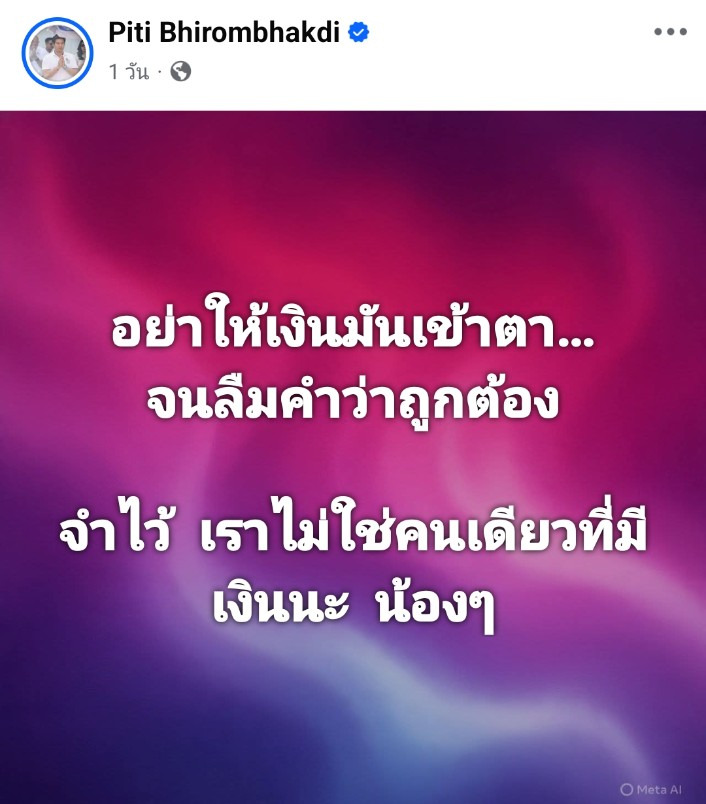 จู่ๆก็มีเรื่องให้ชาวเน็ตใส่ใจ เมื่อ ต๊อด ปิติ ภิรมย์ภักดี สามีของนางเอกดัง นุ่น วรนุช ภิรมย์ภักดี ออกมาโพสต์ลอยๆผ่านทางเฟซบุ๊กส่วนตัว "Piti Bhirombhakdi" ว่า "อย่าให้เงินมันเข้าตา…จนลืมคำว่าถูกต้อง จำไว้ เราไม่ใช่คนเดียวที่มีเงินนะ น้องๆ" และตามมาติดๆด้วย "เวลาคุณไปด่าคนอื่น มันไม่ได้ทำให้คุณดูดีขึ้น รู้ยัง"