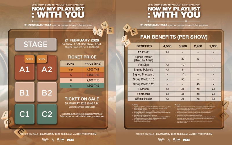 ร่วมเป็นส่วนหนึ่งของค่ำคืนแห่งความทรงจำในงาน “2026 YOON SEOBIN FAN MEETING IN BANGKOK <NOW MY PLAYLIST: WITH YOU>” เปิดจำหน่ายบัตร วันอาทิตย์ที่ 25 มกราคม 2569 เวลา 10.00 น. เป็นต้นไป ซื้อบัตรได้ที่ https://kon-ticket.com/bookticket/detail/2026-yoon-seobin-fan-meeting ราคาบัตร 4,500 / 3,900 / 2,900 / 1,900 บาท (ราคาไม่รวมค่าธรรมเนียมการออกบัตรและภาษี) พิเศษ! ลุ้นเป็นผู้โชคดีสำหรับ Fan Benefits เมื่อซื้อบัตรภายในวันที่ 25 มกราคม - 14 กุมภาพันธ์ 2569 เวลา 23.59 น. เท่านั้น