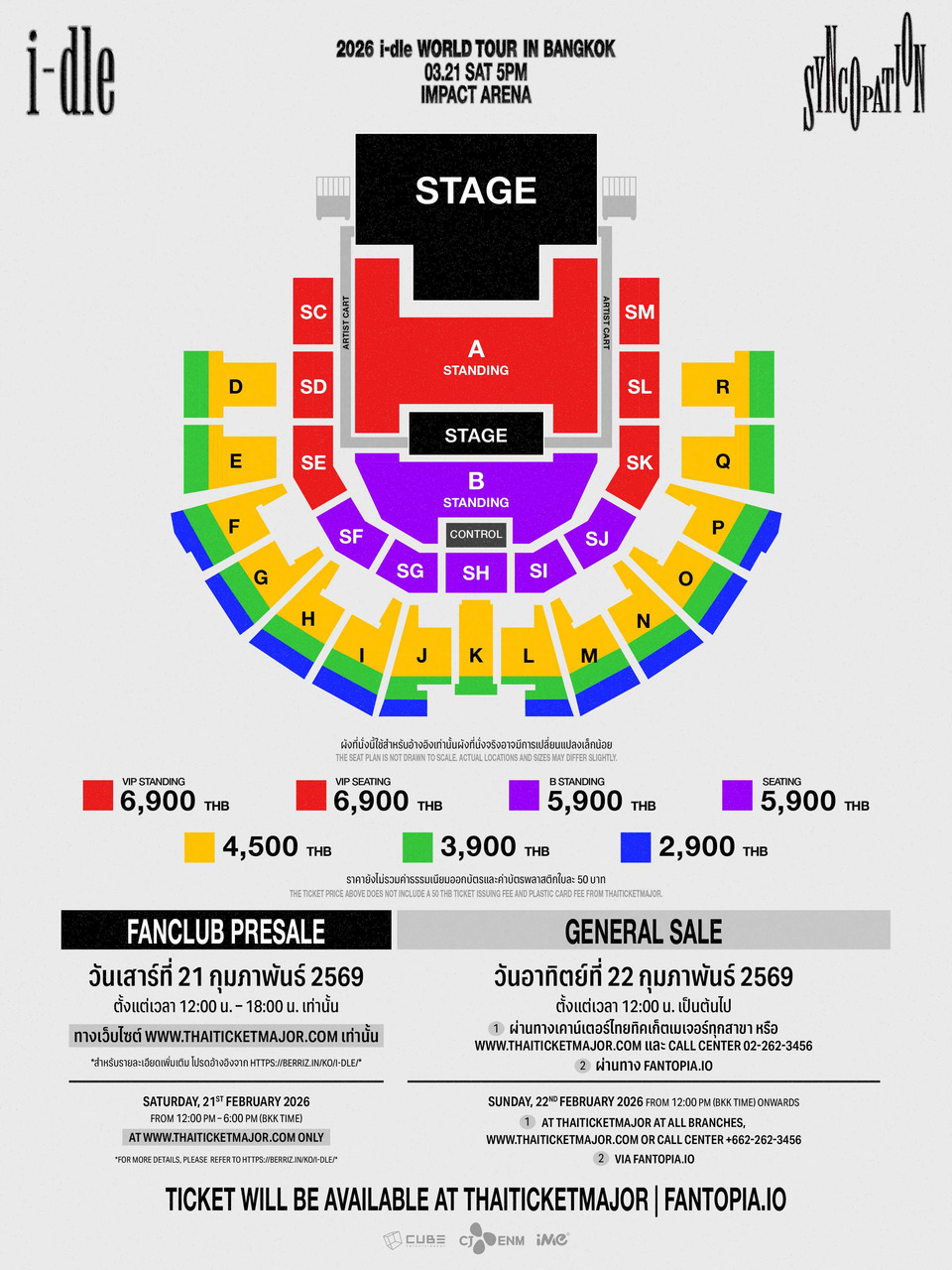 NEVERLAND ชาวไทย ล็อกคิวรอไปร่วมสร้างความทรงจำครั้งใหม่กับ i-dle ในคอนเสิร์ต 2026 i-dle WORLD TOUR [Syncopation] IN BANGKOK ไว้ได้เลย เปิดขายบัตรรอบ FANCLUB PRESALE วันเสาร์ที่ 21 กุมภาพันธ์ 2569 เวลา 12.00 – 18.00 น. ผ่านทาง www.thaiticketmajor.com เท่านั้น เปิดจำหน่ายทุกโซน ทุกราคา ในจำนวนจำกัด และเปิดขายบัตรรอบทั่วไปในวันอาทิตย์ที่ 22 กุมภาพันธ์ 2569 ตั้งแต่เวลา 12.00 น. เป็นต้นไป ผ่านทาง www.thaiticketmajor.com, เคาน์เตอร์ไทยทิกเก็ตเมเจอร์ทุกสาขา, Call Center 02-262-3456 เปิดจำหน่ายทุกโซนยกเว้นโซน SE/SF/SJ/SK/D/E/R/Q และผ่านทาง www.fantopia.io จำหน่ายบัตรเฉพาะโซน SE/SF/SJ/SK/D/E/R/Q เท่านั้น* บัตรราคา VIP PACKAGE 6,900 (บัตรยืนและนั่ง) / 5,900 (บัตรยืนและนั่ง) / 4,500 / 3,900 และ 2,900 บาท พร้อมสิทธิพิเศษสุดเอ็กซ์คลูซีฟมากมาย ติดตามรายละเอียดเพิ่มเติมได้ที่ Facebook และ TikTok : @imethailand / X และ Instagram : @ime_th