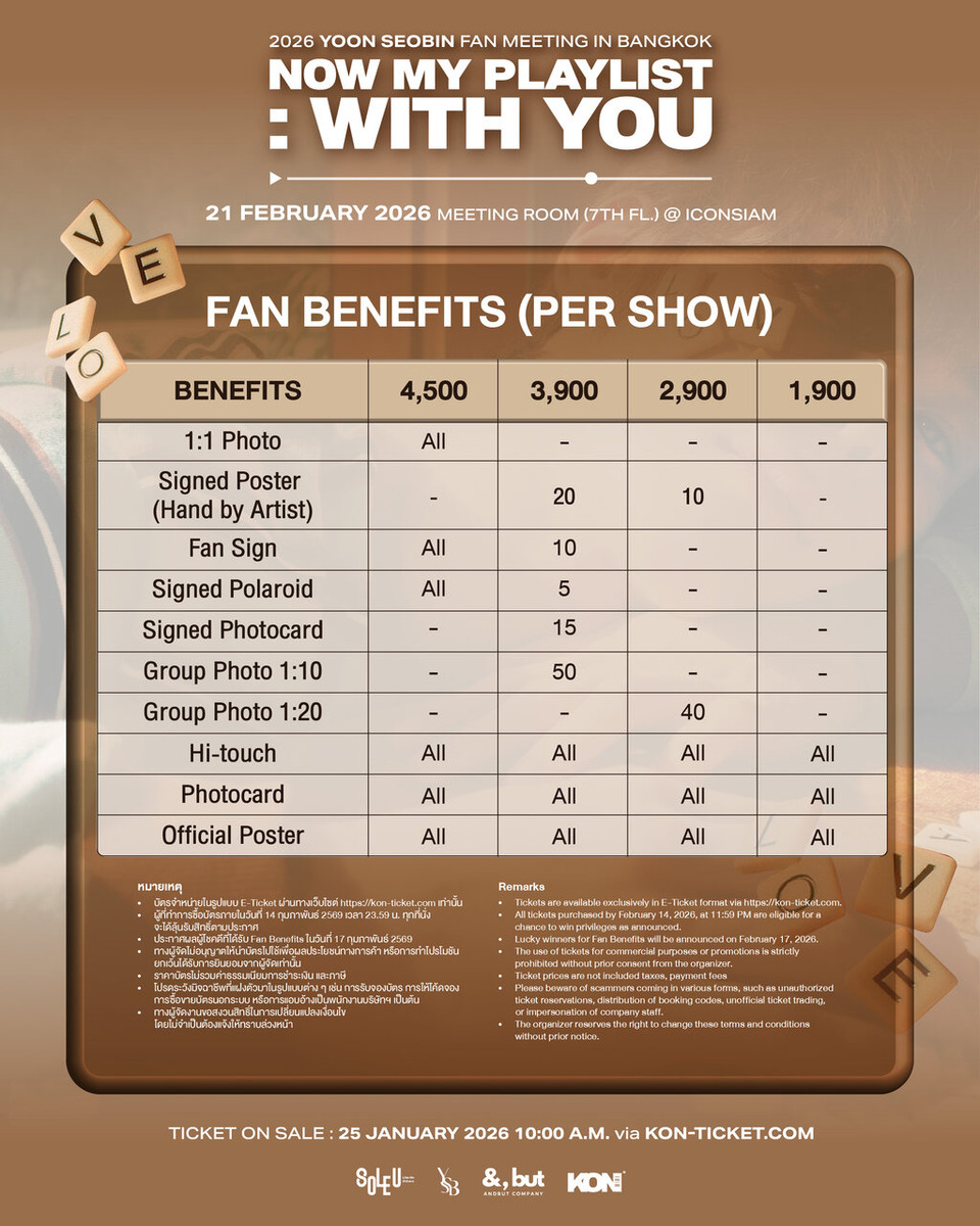 ร่วมเป็นส่วนหนึ่งของค่ำคืนแห่งความทรงจำในงาน “2026 YOON SEOBIN FAN MEETING IN BANGKOK <NOW MY PLAYLIST: WITH YOU>” เปิดจำหน่ายบัตร วันอาทิตย์ที่ 25 มกราคม 2569 เวลา 10.00 น. เป็นต้นไป ซื้อบัตรได้ที่ https://kon-ticket.com/bookticket/detail/2026-yoon-seobin-fan-meeting พิเศษ! ลุ้นเป็นผู้โชคดีสำหรับ Fan Benefits เมื่อซื้อบัตรภายในวันที่ 25 มกราคม - 14 กุมภาพันธ์ 2569 เวลา 23.59 น. เท่านั้น