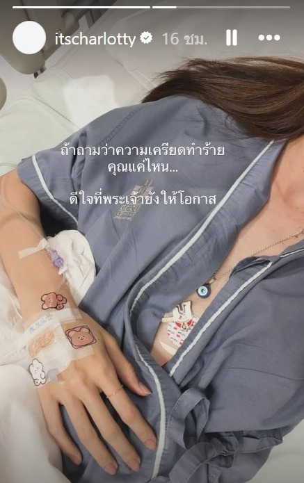 ทำเอาแฟนคลับแห่เป็นห่วงหนักมาก เมื่อ “ชาล็อต ออสติน” ได้โพสต์ภาพนสตอรี่อินสตาแกรม ขณะที่เจ้าตัวนอนอยู่บนเตียงผู้ป่วยในโรงพยาบาล โดยมีสายน้ำเกลือเจาะที่แขน ท่ามกลางกระแสข่าวลือว่ามาจากความเครียดดราม่าร้อนก่อนหน้านี้ โดย ชาล็อต ระบุข้อความตัดพ้อเบาๆว่า “ถ้าถามว่าความเครียดทำร้ายคุณแค่ไหน…ดีใจที่พระเจ้ายังให้โอกาส”
