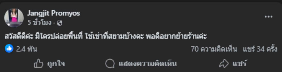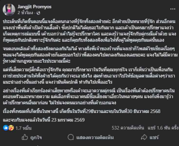 จนตอนหลังเค้าทั้งสองยังตกลงกันไม่ได้ ทางฝั่งพี่เจ้าของร้านที่แจงเช่าก็โพสต์โซเชียลเรื่อยๆ พอแจงได้พูดคุยกันสองฝ่ายก็เลยบอกไปว่าพี่สองคนไปตกลงกันเองเลยนะคะ แจงไม่ได้มีความรู้ทางด้านกฎหมายอะไรประมาณนี้ค่ะ