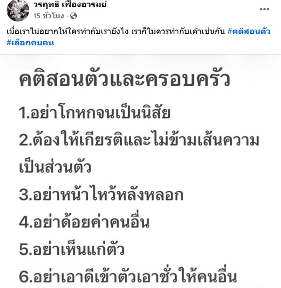 “เมื่อเราไม่อยากให้ใครทำกับเรายังไง เราก็ไม่ควรทำกับเขาเช่นกัน” พร้อมติดแฮชแท็ก #คติสอนตัว และ #เลือกคบคน