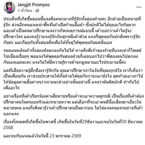 จนตอนหลังเค้าทั้งสองยังตกลงกันไม่ได้ ทางฝั่งพี่เจ้าของร้านที่แจงเช่าก็โพสต์โซเชียลเรื่อยๆ พอแจงได้พูดคุยกันสองฝ่ายก็เลยบอกไปว่าพี่สองคนไปตกลงกันเองเลยนะคะ แจงไม่ได้มีความรู้ทางด้านกฎหมายอะไรประมาณนี้ค่ะ