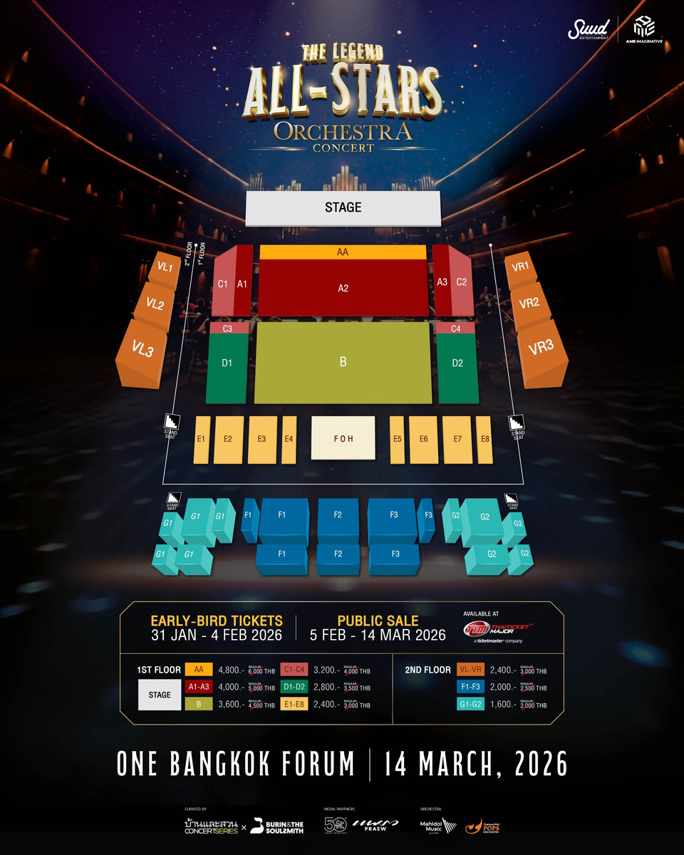 เหล่าแฟนคลับของศิลปินทั้ง 3 ยุค 80s, 90s และ 2000s ระดับตำนาน เตรียมตัวให้พร้อมเพื่อกดบัตรคอนเสิร์ต “THE LEGEND ALL STARS ORCHESTRA CONCERT” ให้ทัน เพราะเป็นอีกหนึ่งปรากฏการณ์ทางดนตรีที่จะตราตรึงใจและหาฟังไม่ได้จากที่ไหน ที่จะได้ดื่มด่ำไปกับบทเพลงที่คิดถึงที่จะถูกนำมาเรียงร้อยเป็นเรื่องราวในรูปแบบใหม่ ผสานพลังเสียงระดับคุณภาพของเหล่าศิลปินระดับตำนานบนเวทีออร์เคสตรา ถ่ายทอดความไพเราะนี้แบบจัดเต็มกับวงดนตรีเครื่องสายบรรเลงโดยนักดนตรีกว่า 30 ชีวิต จากวง Thailand Phil POPS Orchestra