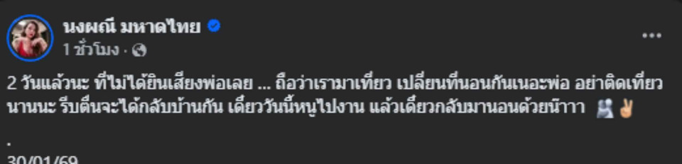 “2 วันแล้วนะ ที่ไม่ได้ยินเสียงพ่อเลย ถือว่าเรามาเที่ยวเปลี่ยนที่นอนกันเนอะพ่อ อย่าติดเที่ยวนานนะ รีบตื่นจะได้กลับบ้านกัน เดี๋ยววันนี้หนูไปงาน แล้วเดี๋ยวกลับมานอนด้วยน้าา“