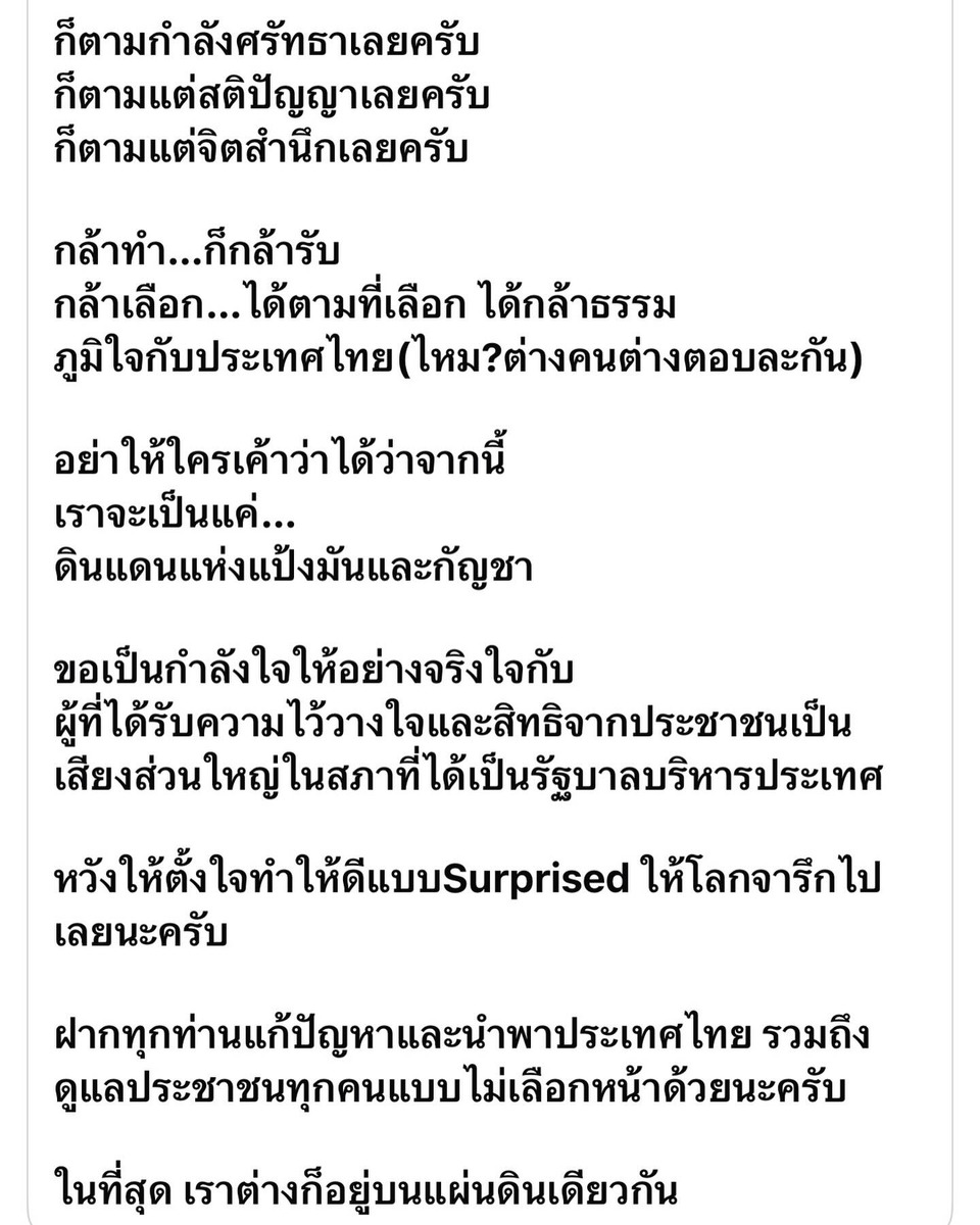 อย่าให้ใครเค้าว่าได้ว่าจากนี้ เราจะเป็นแค่… ดินแดนแห่งแป้งมันและกัญชา ขอเป็นกำลังใจให้อย่างจริงใจกับ ผู้ที่ได้รับความไว้วางใจและสิทธิจากประชาชนเป็นเสียงส่วนใหญ่ในสภาที่ได้เป็นรัฐบาลบริหารประเทศหวังให้ตั้งใจทำให้ดีแบบSurprised ให้โลกจารึกไปเลยนะครับ ฝากทุกท่านแก้ปัญหาและนำพาประเทศไทย รวมถึงดูแลประชาชนทุกคนแบบไม่เลือกหน้าด้วยนะครับ ในที่สุด เราต่างก็อยู่บนแผ่นดินเดียวกัน"