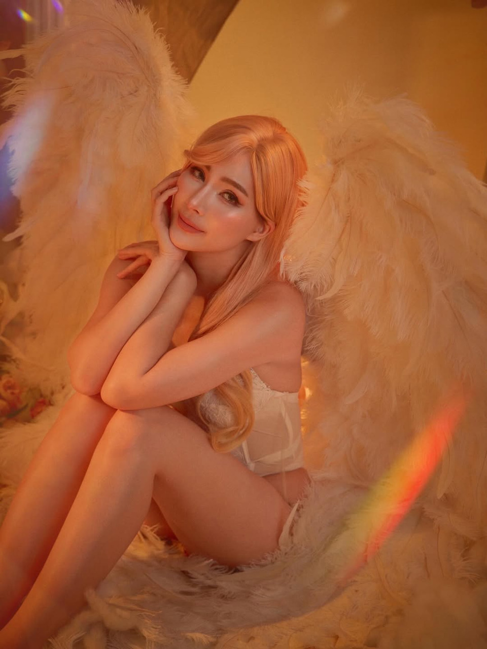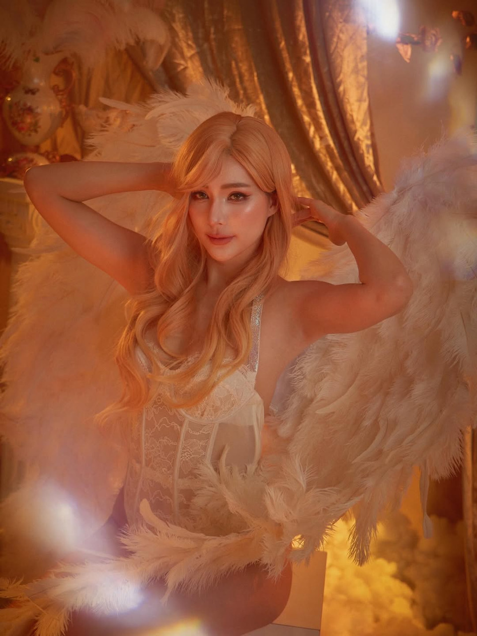 ในภาพดังกล่าว จันจิปรากฏตัวในชุดคอร์เซ็ตลูกไม้สีขาว เสริมลุคด้วยปีกนางฟ้าขนนุ่ม ให้ความรู้สึกเหมือนเทพธิดาแห่งความรักที่หลุดออกมาจากเทพนิยาย ผสานเมกอัพโทนอุ่นและทรงผมสีทองพลิ้วไหว ยิ่งขับให้ลุคดูละมุนแต่แฝงเสน่ห์ชวนมอง