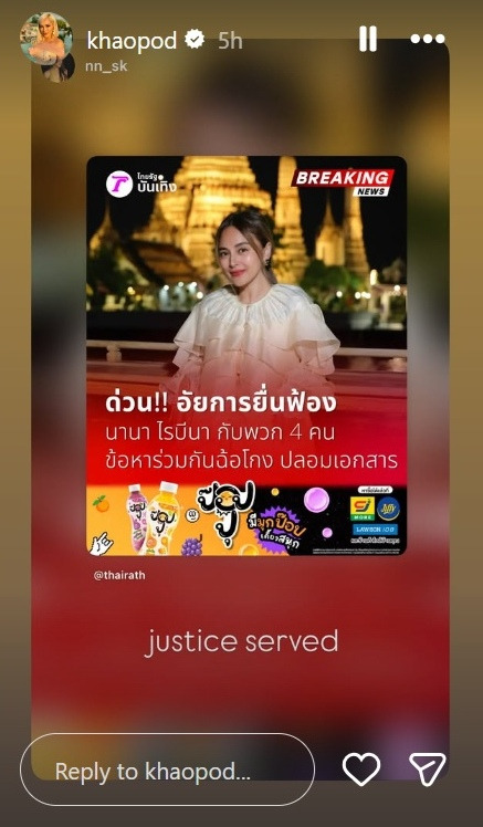 “ไฮโซข้าวโพด” ได้ออกมาเคลื่อนไหวผ่านไอจีสตอรี่ โดยการรีโพสต์ข่าวพร้อมระบุข้อความว่า Justice Served (ความยุติธรรมได้เกิดขึ้นแล้ว)