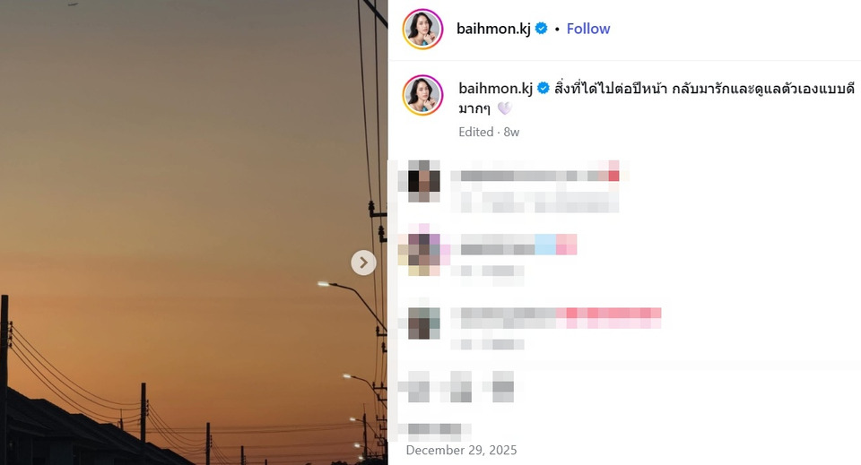 และเมื่อเข้าส่องไอจีฝ่ายหญิงพบว่า เมื่อวันที่ 29 ธ.ค. ก่อนสิ้นปี เจ้าตัวยังได้โพสต์ภาพ พร้อมเขียนแคปชั่นว่า "สิ่งที่ได้ไปต่อปีหน้า กลับมารักและดูแลตัวเองแบบดีมากๆ"